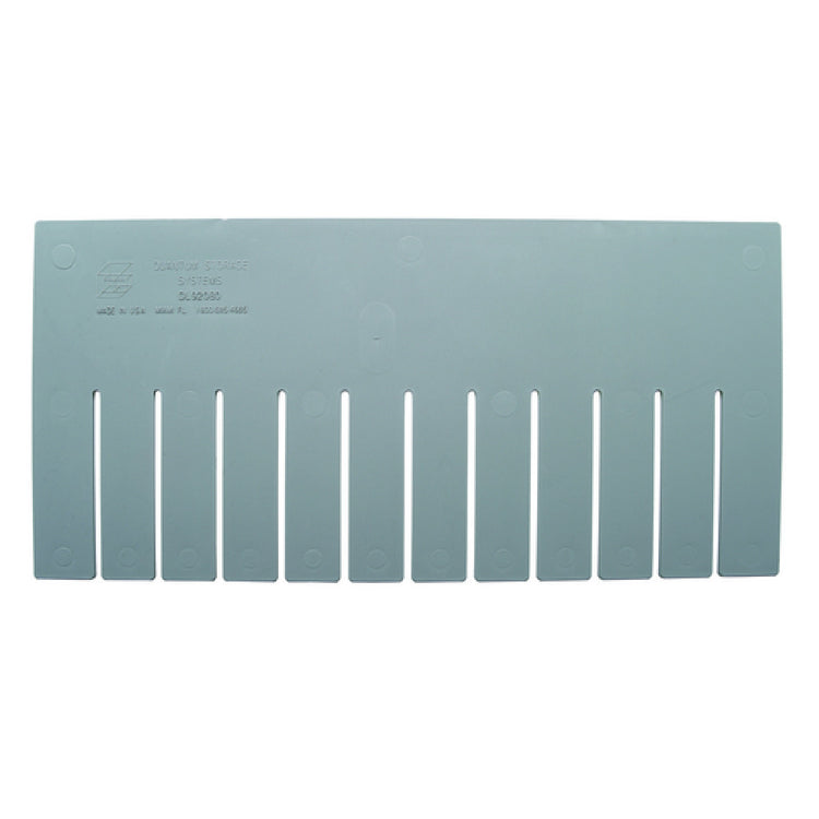 The Quantum DL92080 Long Divider - for use with DG92080, gray (pack of 6) - is a specialized organizational accessory designed for industrial and commercial settings. Engineered to enhance storage efficiency, this set of long dividers is tailored specifically for integration with the DG92080 storage units. Crafted in a neutral gray color, these dividers seamlessly blend with various industrial aesthetics while providing practical segmentation within storage bins. The divider pack includes six individual units, ensuring ample customization for diverse storage needs. As a product made in the USA, it underscores a commitment to quality and manufacturing excellence, suitable for industries seeking reliable storage solutions. The Quantum DL92080 Long Divider offers a straightforward solution for maximizing space utilization, making it a useful asset for warehouse operations, retail inventory management, and production environments. Its compatibility and precision design make it indispensable for users looking to organize components, tools, or parts systematically within the DG92080 containers. This product's value proposition lies in its ability to streamline organization, thereby enhancing operational efficiency and reducing retrieval time in high-paced industrial settings. Its robust construction and strategic design position it as a crucial accessory for maximizing storage utility in professional environments.