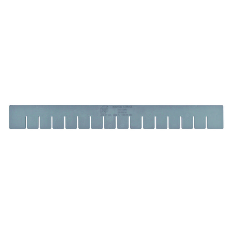 The Quantum DL93030 Long Divider is a specialized organizational accessory designed specifically for use with the DG93030 series. This product comes in a pack of six, allowing for extensive customization and optimization of storage solutions. The dividers are colored gray, providing a neutral and professional appearance that seamlessly integrates into various storage environments. Manufactured in the USA, the Quantum DL93030 dividers stand as a testament to quality and durability. These dividers are particularly beneficial for industries that require meticulous organization and streamlined operations, such as warehousing, logistics, and manufacturing sectors. By employing these dividers, businesses can efficiently categorize and access items stored within the DG93030 units, ultimately enhancing productivity and workflow. The precise design of the DL93030 ensures compatibility and stability, preventing displacement and ensuring long-term use. This product is ideal for professionals seeking a reliable and efficient method to manage their inventory and components, offering an innovative solution to meet the demands of modern industrial applications.
