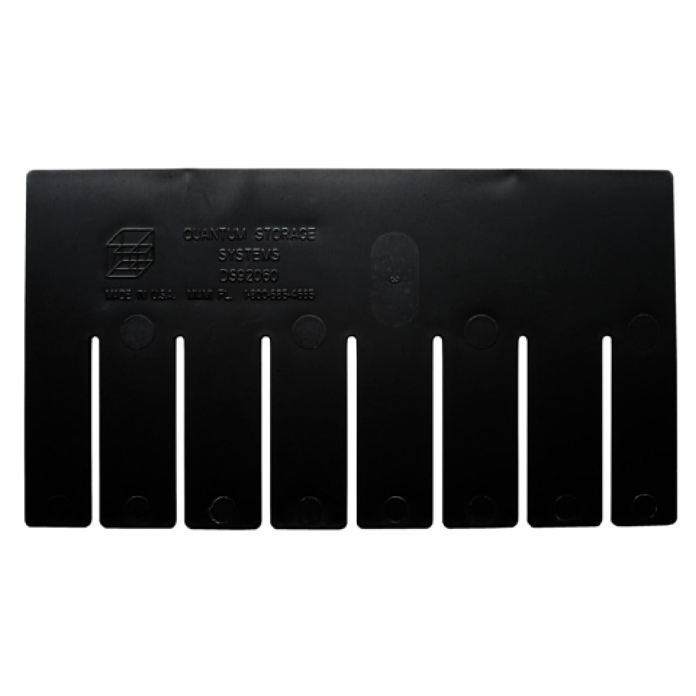 The Quantum DS92060CO Short Divider is a specialized product designed for use with the DG92060CO, serving as an essential component for efficient organizational solutions. With its conductive properties, this short divider is a critical asset in environments where static electricity management is crucial, such as electronic manufacturing, research labs, and storage facilities dealing with sensitive components. Each pack contains six dividers, all in sleek black, offering a visually cohesive and professional appearance. Manufactured in the USA, the Quantum DS92060CO ensures high standards of quality and durability, making it a reliable choice for various industrial applications. The product's compatibility with the DG92060CO highlights its role in enhancing the functionality and versatility of storage systems, providing tailored solutions for specific industry needs. This feature makes it particularly valuable for sectors where space optimization and component protection are vital. By integrating the Quantum DS92060CO Short Divider into their systems, businesses can achieve a higher level of organization and safety in handling and storing sensitive equipment, underscoring its unique value proposition within its market segment.
