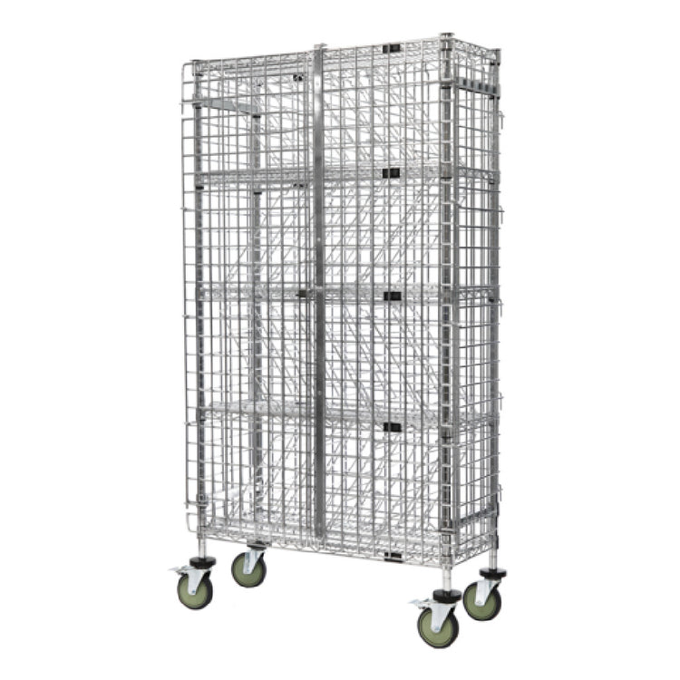 Quantum, M1436-69BWSEC, Security Unit, Mobile, Wine Bulk Storage, 36"W x 18"D x 69"H, includes: (1) top shelf, (1) bottom shelf, (3) intermediate shelves, (4) bottle support insterts, (12) slanted dividers, (1) security panel set (includes back and sides), (1) pair security panel doors, with (4) casters( 2 with brakes) and donut bumpers, chrome plated finish, NSF