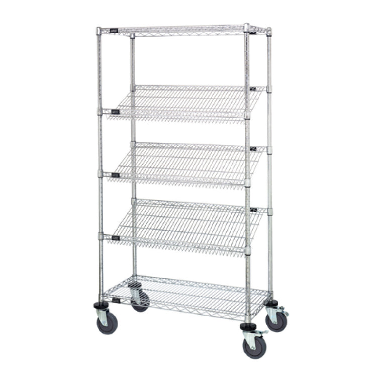 The Quantum M1836SL6C Mobile Cart is a versatile and robust storage solution designed to meet diverse industry needs with its precise dimensions of 36" wide, 18" deep, and 69" high. This mobile cart is engineered for efficiency, featuring a combination of (2) flat wire shelves and (3) slanted wire shelves, providing customizable storage configurations ideal for various applications. Supported by (4) sturdy 63" posts, the cart is designed to withstand demanding environments. Its mobility is enhanced by (4) 5" thermoplastic resin casters, with (2) equipped with brakes to ensure stability when needed. To protect both the cart and surrounding surfaces, (4) donut bumpers are included, minimizing potential damage during movement. The cart's aesthetic and durability are further enhanced by a chrome-plated finish, making it an appealing choice for sectors such as healthcare, hospitality, and warehousing. This mobile cart delivers a seamless blend of functionality and resilience, tailored to support professionals in maintaining an organized, efficient, and mobile workspace.