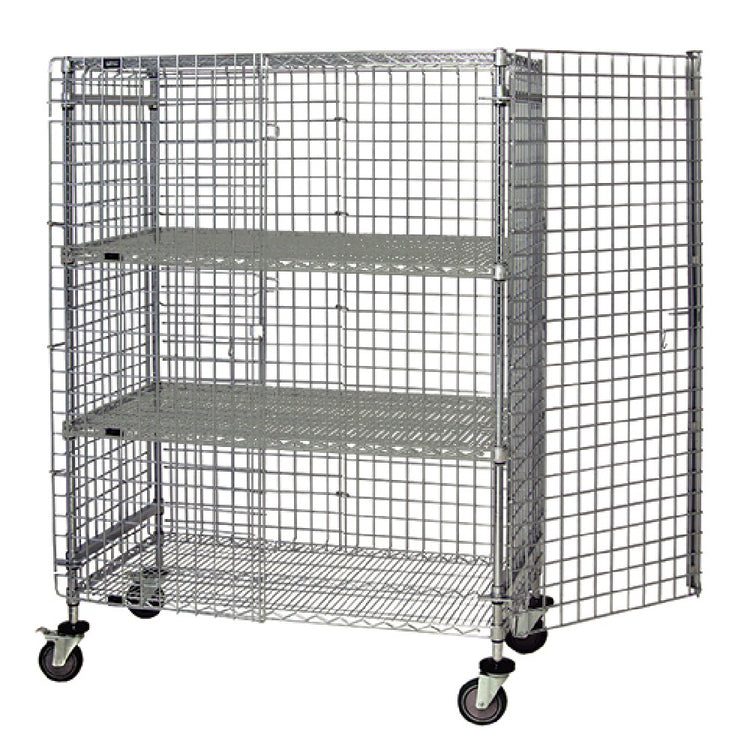 The Quantum M2160-69SEC-2 Security Unit Mobile 60"W X 21"D X 69"H is a meticulously designed mobile security solution tailored for diverse industry needs. This unit boasts a spacious design with dimensions of 60 inches in width, 21 inches in depth, and 69 inches in height, providing ample storage and security for various applications. It includes one top shelf, one bottom shelf, and two intermediate shelves, offering versatile storage configurations. The security panel set, which encompasses both the back and sides, ensures enhanced protection of stored items. Additionally, the unit features a pair of security panel doors, adding an extra layer of security. The four sturdy posts support the structure, while the inclusion of four casters, two equipped with brakes, facilitates easy mobility and stable positioning. Its chrome-plated finish not only enhances its aesthetic appeal but also ensures durability. The unit is NSF certified, highlighting its compliance with strict public health and safety standards. The Quantum M2160-69SEC-2 Security Unit is an ideal choice for environments where mobility, security, and organizational efficiency are paramount, making it a valuable asset across a wide range of industry sectors.