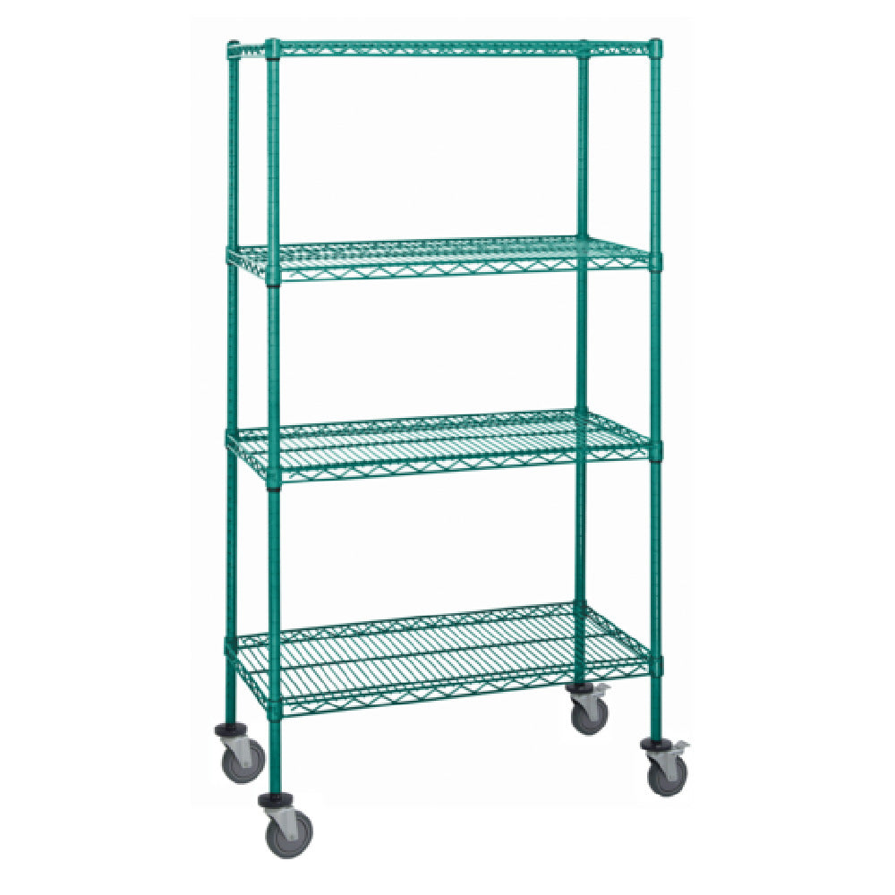The Quantum M2448P47 Mobile Cart, measuring 48"W x 24"D x 80"H, is an industrial-grade solution designed for versatile utility across various sectors. This mobile cart features four wire shelves that provide ample storage space while allowing for easy visibility and accessibility of stored items. Supported by four 74"H posts, the cart ensures stability and robust structural integrity. The inclusion of four donut bumpers enhances protection against accidental impacts, preserving both the cart and its surroundings. Equipped with four 5" thermoplastic resin casters, two of which come with brakes, the cart offers smooth maneuverability and secure positioning as needed. The green epoxy antimicrobial coating not only adds a layer of durability but also offers enhanced resistance against microbial growth, making it particularly suitable for environments where hygiene is paramount, such as healthcare facilities and food service operations. This mobile cart is engineered to meet the demands of various industries, offering a combination of functionality, durability, and mobility, thereby making it an essential asset for storage and transportation needs.