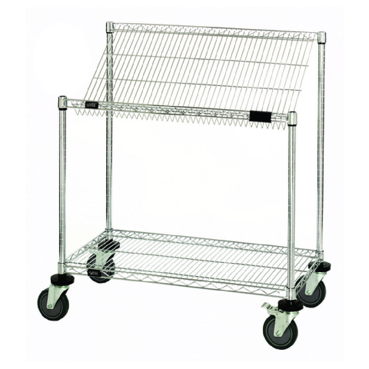 The Quantum M2448SL34C Mobile Cart 48"W x 24"D x 40"H is a versatile and robust utility cart designed to meet the demanding needs of various industry segments. This mobile cart boasts a chrome-plated finish, providing both durability and a sleek aesthetic suitable for professional environments. It features a flat wire shelf and a slanted wire shelf, offering flexible storage and organization solutions. The cart is supported by two 29" posts and two 34" posts, enhancing its structural integrity. For mobility, it is equipped with four 5" thermoplastic resin casters, including two with brakes, ensuring stability and ease of movement. Additionally, the inclusion of four donut bumpers helps protect surrounding surfaces from accidental damage during transport. With dimensions of 48" in width, 24" in depth, and 40" in height, this cart offers ample space for storage while maintaining a compact footprint, making it an ideal choice for industries requiring efficient space management. The Quantum M2448SL34C Mobile Cart is engineered to support the dynamic needs of sectors such as healthcare, hospitality, and manufacturing, providing a reliable and adaptable solution for transporting and organizing a wide array of items.