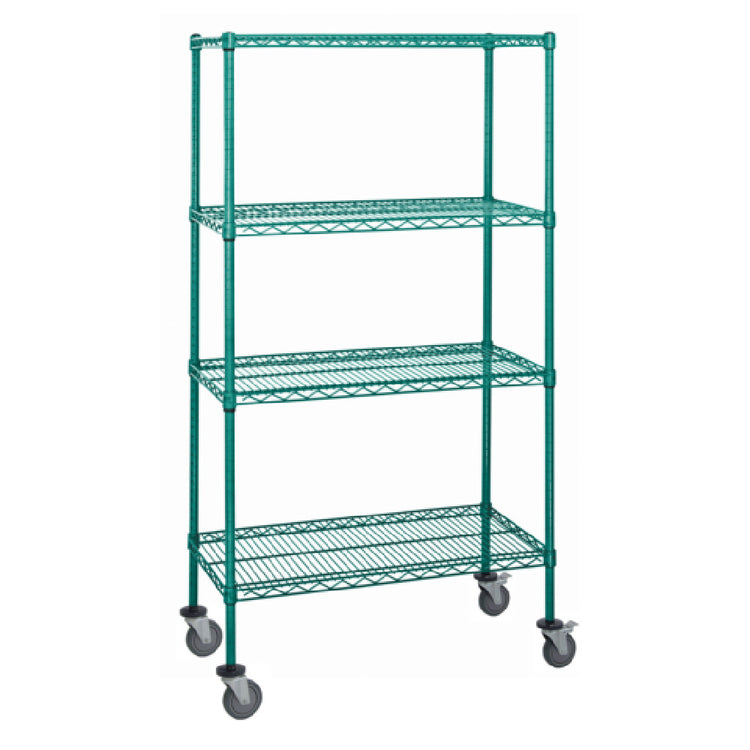 The Quantum M2460P47 Mobile Cart 60"W x 24"D x 80"H is an expertly designed unit that combines functionality and durability to meet the needs of various industries requiring efficient storage and mobility solutions. This mobile cart features four wire shelves capable of supporting diverse items, making it suitable for sectors such as healthcare, food service, or industrial environments. It includes four 74"H posts, providing a stable structure for its substantial height and shelving capacity. The cart is equipped with four 5" thermoplastic resin casters, two of which have brakes, ensuring both smooth maneuverability and secure stationary placement when needed. An additional layer of protection is offered by four donut bumpers, safeguarding surrounding areas and the cart itself from accidental impacts. The green epoxy antimicrobial coating adds a level of hygiene and longevity, making it particularly valuable in settings where cleanliness is paramount. This feature-rich mobile cart represents a reliable and versatile asset across multiple market segments, emphasizing adaptable storage and transport capabilities within tight workspaces or expansive facilities alike.