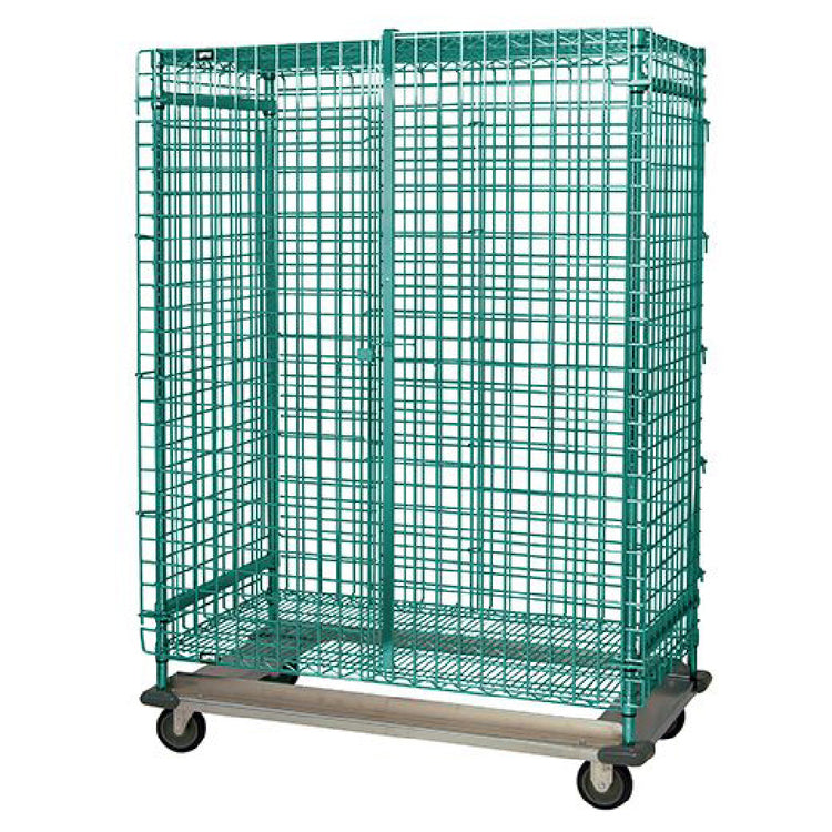 The Quantum MD2448-70SECP Security Unit Mobile With Dolly Base 48"W X 24"D X 70"H is a versatile storage solution designed for secure and efficient organization. Featuring a comprehensive set of components, it includes one top shelf and one bottom shelf for ample storage capacity, along with a security panel set that includes the back and sides for enhanced safety. The unit is equipped with a pair of security panel doors, ensuring your items are locked away securely. Supported by four sturdy posts, the structure is both durable and reliable. It is mounted on a dolly base with four plate casters - two rigid and two swivel with brakes, allowing for easy mobility and stability when in use. The green epoxy antimicrobial finish not only gives it a sleek appearance but also provides an additional layer of protection against microbial contamination. Certified by NSF, this unit is shipped KD (knocked down) for convenient assembly and transport. The Quantum MD2448-70SECP is a practical choice for businesses requiring a robust, mobile, and secure storage solution, catering to various industry needs while prioritizing hygiene and safety standards.