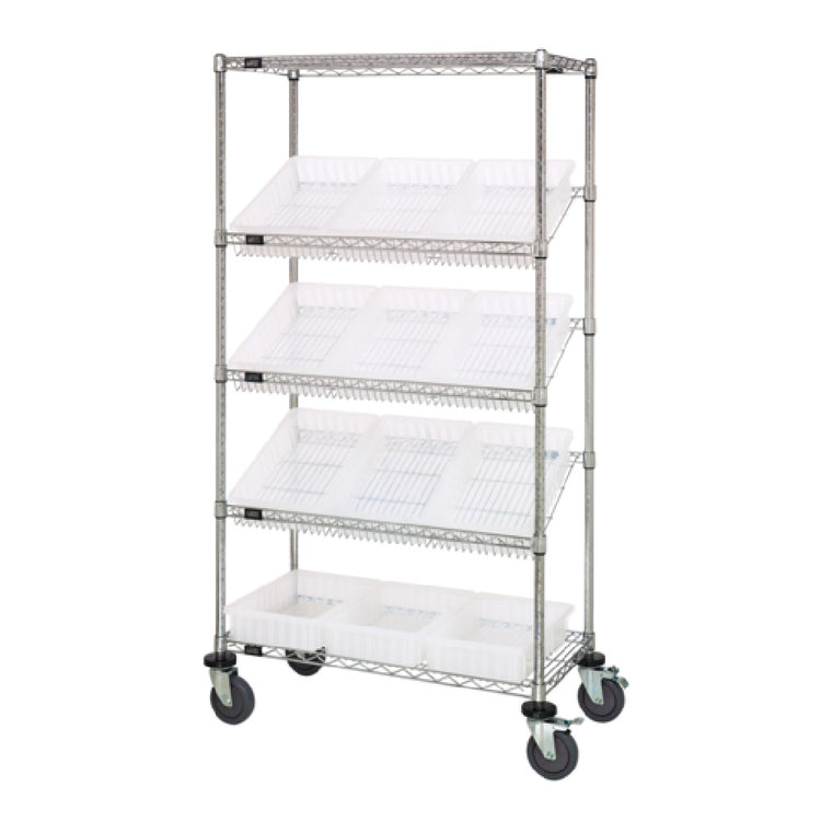 The Quantum MWRS-5-92035CL Bin Systems Unit Mobile 36"W x 18"D x 69"H is a versatile storage solution, meticulously engineered to meet various industry needs with precision and efficiency. This unit features a combination of two flat wire shelves and three slanted wire shelves, offering a customizable storage experience suited for diverse applications. Additionally, it includes four robust posts for structural stability and twelve clear bins, each measuring 16-1/2"W x 10-7/8"D x 3-1/2"H, allowing for organized storage and easy identification of contents. Equipped with four 5" swivel polyurethane casters, two of which have brakes, this unit ensures smooth mobility and secure positioning. The chrome-plated finish not only provides a sleek aesthetic but also enhances durability. Certified by NSF, this bin system aligns with stringent health and safety standards, making it particularly valuable in environments requiring such compliance. Shipped in a knocked-down (KD) format, it facilitates convenient transportation and assembly. This bin system is an asset for environments ranging from medical facilities to industrial settings, where efficient storage and mobility are paramount.