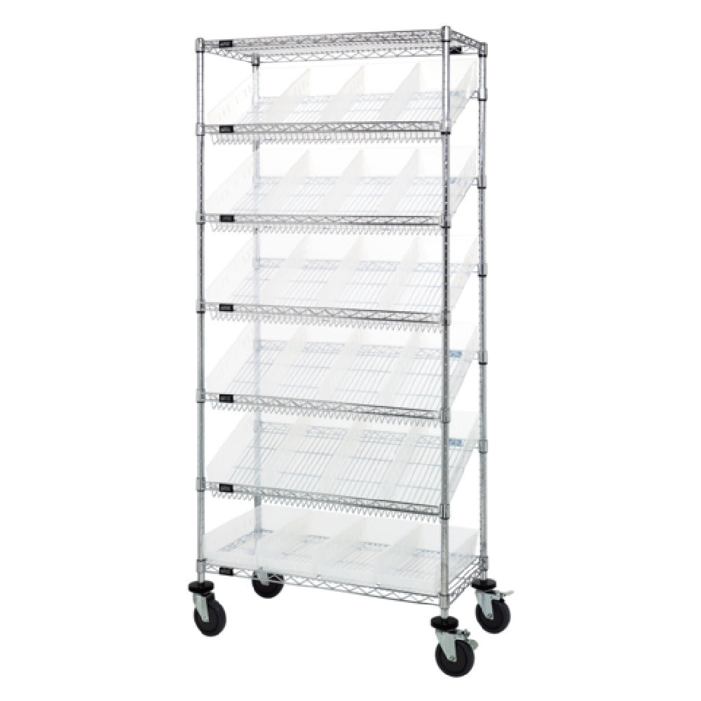 The Quantum MWRS-7-108CL Bin Systems Unit Mobile 36"W X 18"D X 80"H is a meticulously engineered storage solution designed to meet the diverse organizational needs across various industry segments. This mobile unit features an efficient combination of (2) flat wire shelves and (5) slanted wire shelves, providing a versatile framework for storing a variety of items. Its sturdy structure is supported by (4) posts, ensuring stability and durability. The unit includes (24) clear bins, each measuring 17-7/8"W x 8-3/8"D x 4"H (QSB108CL), offering ample space for orderly storage and easy identification of contents. The inclusion of (4) 5" swivel polyurethane casters, (2) of which are equipped with brakes, facilitates effortless mobility and secure positioning in any workspace. The chrome-plated finish adds a layer of protection against corrosion while enhancing the unit's aesthetic appeal. Shipped in a knock-down (KD) form for convenient assembly, this unit is NSF certified, ensuring compliance with rigorous public health and safety standards. The Quantum MWRS-7-108CL Bin Systems Unit is uniquely valuable for sectors requiring organized, mobile, and accessible storage solutions, such as manufacturing, warehousing, and healthcare, making it an essential asset for operational efficiency and space optimization.