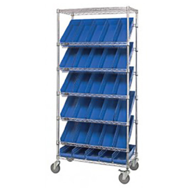 The Quantum MWRS-7-606 Bin Systems Unit Mobile 36"L X 18"W X 80"H is a versatile storage solution designed for varied industrial applications, particularly excelling in dry storage environments. This robust unit includes four sturdy posts and a combination of two flat wire shelves and five slanted wire shelves, facilitating efficient organization and access to stored items. At the heart of its utility are eighteen bins, each measuring 17-5/8"L x 8-3/8"W x 4-5/8"H, which are available in multiple colors to suit specific storage needs or color-coding systems. The unit's mobility is enhanced by four 5" swivel polyurethane casters, two of which are equipped with brakes for secure positioning, making it easy to move and stabilize as necessary. Finished with chrome plating, the MWRS-7-606 not only ensures a durable construction but also complements the aesthetic of modern industrial settings. Shipped in a knock-down (KD) format, it offers ease of assembly. This unit stands as an ideal choice for businesses seeking a reliable and adaptable storage solution, with its technical specifications tailored to support efficient workflow in a variety of industry segments.