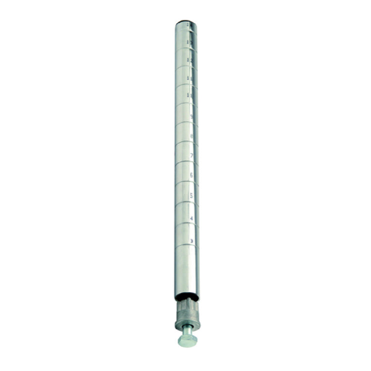 The Quantum P74CX Post with Leveling Legs is a meticulously designed structural component, standing at an imposing height of 74 inches. This product is distinguished by its precision-engineered numbered grooves, marked in 1-inch increments, allowing for accurate and adjustable configurations. Engineered for stability, it features leveling legs that ensure secure placement on variable surfaces, making it suitable for diverse industrial environments. The P74CX post includes one pre-inserted W-PLI and one W-PLB, enhancing its structural integrity and ease of use in assembly applications. Its chrome-plated finish not only provides an aesthetically appealing sheen but also offers durable resistance against corrosion, ensuring long-lasting performance. The Quantum P74CX Post is NSF certified, guaranteeing compliance with high safety and quality standards required in professional settings. This post is ideal for sectors that demand reliable and adaptable infrastructure solutions, providing a robust and versatile foundation for customized shelving and storage systems.