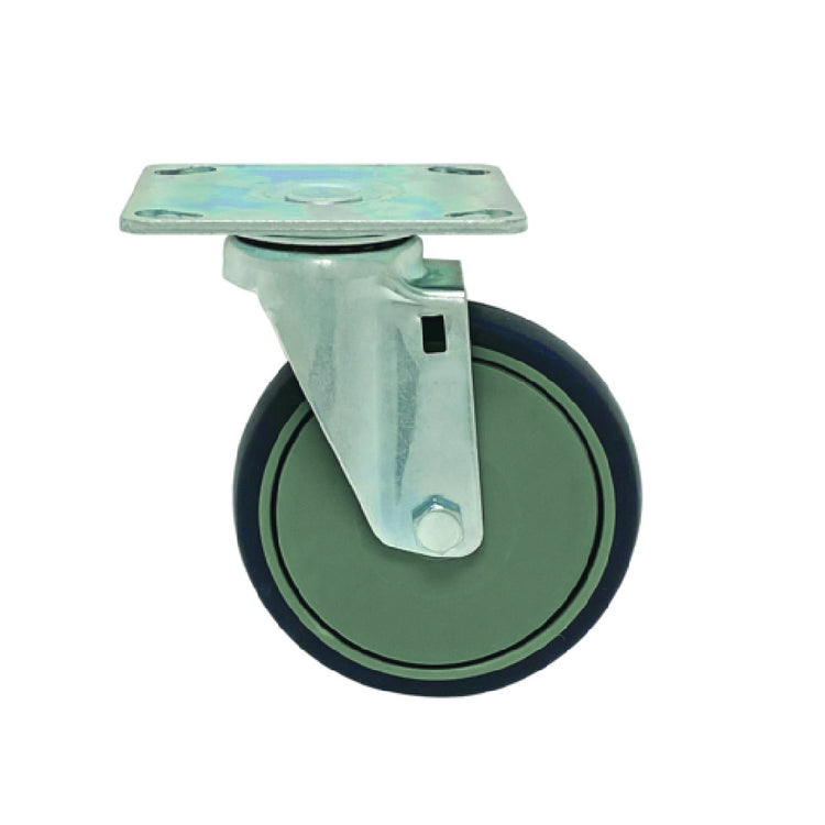 The Quantum PT-PS Swivel Thermoplastic Resin Caster 5" x 1-1/4" is a specialized component designed for various industrial applications requiring mobility solutions. Measuring 5 inches in diameter and 1-1/4 inches in width, this caster is crafted from high-quality thermoplastic resin, known for its durability and resilience under a range of environmental conditions. The swivel design allows for smooth maneuverability, making it ideal for use in settings where precision movement is crucial, such as in manufacturing facilities, medical equipment, or warehousing operations. Its construction supports a seamless integration into existing equipment, providing a reliable and sturdy base that enhances the functionality of industrial carts and other mobile units. The use of thermoplastic resin not only ensures a lighter weight compared to metal alternatives but also offers resistance to corrosion and wear, extending the lifespan of the caster significantly. This product is particularly beneficial for industries seeking cost-effective yet robust solutions for their mobility needs. The Quantum PT-PS Swivel Thermoplastic Resin Caster embodies a blend of efficiency and durability, making it a valuable choice for businesses looking to optimize their operational workflows through enhanced equipment mobility.