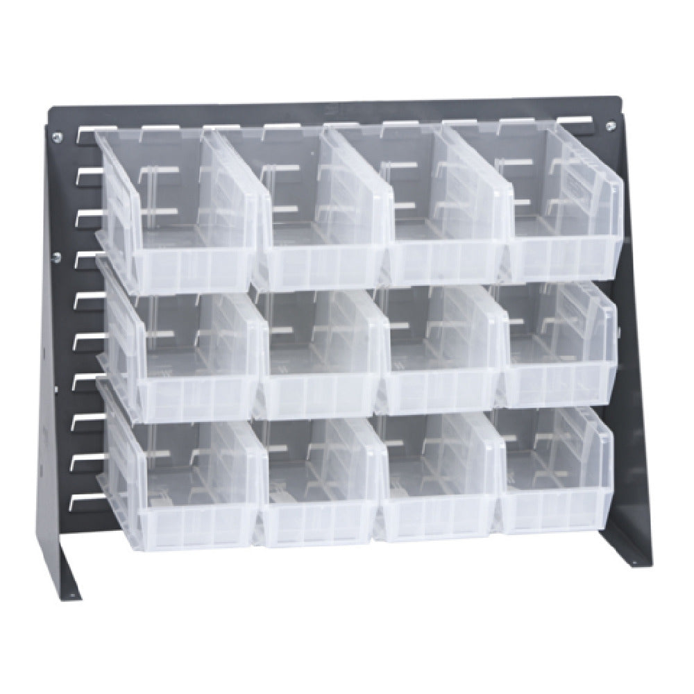 The Quantum QBR-2721-230-12CL Bench Rack is a versatile storage solution designed to meet the demands of various industrial and commercial environments. This louvered model is constructed from robust 16-gauge steel, ensuring durability and longevity, even in the most challenging settings. The rack measures 27-3/4 inches in length, 8 inches in width, and 21 inches in height, making it a compact yet efficient organizer for a variety of workspaces. Its gray enamel finish not only enhances its aesthetic appeal but also provides an additional layer of protection against wear and tear. The inclusion of twelve clear bins, each measuring 10-7/8 inches long, 5-1/2 inches wide, and 5 inches high, offers ample storage for small parts, tools, and supplies, ensuring that items are easily visible and accessible. This makes the Quantum QBR-2721-230-12CL an ideal choice for workshops, warehouses, and assembly lines where quick identification and retrieval of components are essential. Its structural integrity and thoughtful design cater to the needs of industries that require reliable and organized storage solutions, affirming its position as a valuable asset for various market segments within the industry.