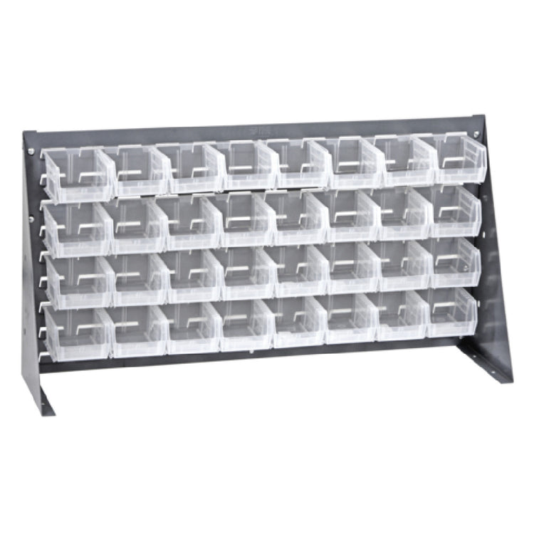 The Quantum QBR-3619-210-32CL Bench Rack is a versatile and efficient storage solution designed for various industrial and organizational needs. This robust unit measures 36 inches in length, 8 inches in width, and 19 inches in height, providing ample space for storing a variety of items. Constructed from durable 16-gauge steel, the bench rack features a louvered design that enhances its structural integrity and longevity. The product comes with a gray enamel finish, adding a sleek, professional appearance while also protecting the steel from corrosion and wear. Included with the bench rack are 32 clear bins, each measuring 5-3/8 inches in length, 4-1/8 inches in width, and 3 inches in height, offering clear visibility of contents for easy organization and access. The Quantum QBR-3619-210-32CL Bench Rack is ideal for use in workshops, warehouses, and manufacturing facilities, where efficient space utilization and organization are critical. Its sturdy construction and functional design make it a reliable choice for professionals seeking to optimize their storage capabilities in a compact form. Whether used for tools, parts, or other essential items, this bench rack provides a practical and durable solution tailored to meet the demands of industrial environments.