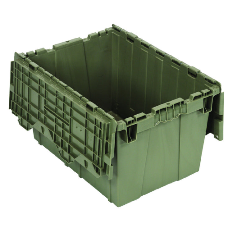 The Quantum QDC2115-12 Distribution Bin Heavy Duty Attached Top Container is an expertly crafted storage solution with precise dimensions of 15"W x 21-3/4"L x 12-3/4"H, offering a generous volume of 1.67 cubic feet. This container is designed to meet the rigorous demands of various industries, providing exceptional durability with its robust polyethylene construction. Notably, the bin features a recessed lid equipped with a padlock eye for enhanced security, making it suitable for environments where safeguarding contents is paramount. The ergonomic handles ensure ease of handling, while the non-slip bottom provides stability, facilitating safe and efficient stacking and transport. Proudly made in the USA, this container is tailored for businesses seeking reliable storage and distribution solutions that maintain product integrity during transit. Its sturdy build and thoughtful design make it an asset across a wide array of applications, from warehouses to retail distribution centers, where heavy-duty, dependable storage is essential. Whether used for storing tools, electronic components, or retail merchandise, the Quantum QDC2115-12 Distribution Bin stands out as a representative of quality and practicality, ensuring contents are securely contained and easily accessible when needed.
