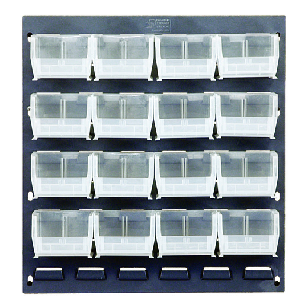 The Quantum QLP-1819-210-16CL Louvered Panel Wall Mounted 18"L x 6"D x 19"H is crafted for diverse industrial applications, integrating functionality and durability. Constructed from heavy-duty 16-gauge cold-rolled steel, this robust panel is designed to support various operational needs across multiple sectors. Its gray enamel-coated finish not only provides a sleek appearance but also enhances its resistance to environmental wear and tear. This louvered panel includes sixteen QUS210 clear bins, offering ample space for organized storage and quick accessibility to essential components or tools, which is crucial for optimizing workflow efficiency in settings such as manufacturing plants, warehouses, and workshops. The clear bins facilitate easy identification of contents, reducing time spent searching for parts and increasing overall productivity. While mounting hardware is not included, this panel's design supports adaptable installation, allowing users to customize its placement according to spatial requirements. Measuring at 18 inches in length, 6 inches in depth, and 19 inches in height, the Quantum QLP-1819-210-16CL Louvered Panel is compact yet capacious, making it ideal for maximizing utility in constrained spaces. This product exemplifies a blend of practical design and industrial-grade materials, catering to varied demands within industrial and commercial environments.