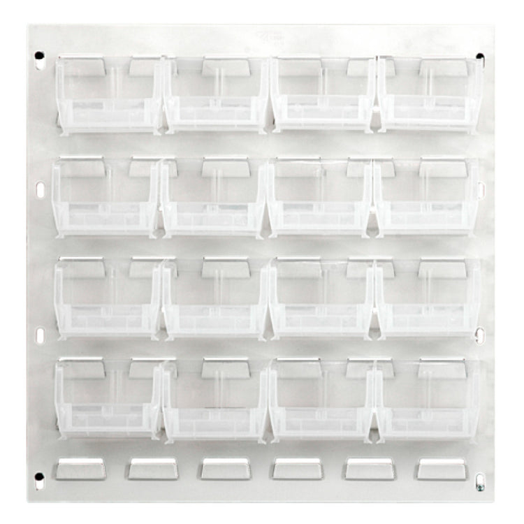 The Quantum QLP-1819HC-220-16CL Louvered Panel Wall Mounted unit is a meticulously designed storage solution, tailored specifically for industries requiring organized and efficient storage systems. This louvered panel, with dimensions of 18 inches in length, 8 inches in depth, and 19 inches in height, is constructed from heavy-duty 16-gauge cold rolled steel, ensuring durability and long-lasting performance. Its oyster white enamel coated finish not only provides an aesthetically pleasing appearance but also offers protection against environmental wear and tear. This unit comes equipped with sixteen QUS220 clear bins, allowing for easy visibility and access to stored items, making it ideal for diverse industrial applications such as manufacturing facilities, workshops, and warehouses. While the mounting hardware is not included, the wall-mounted design maximizes floor space, providing a versatile solution for areas with limited space. The Quantum QLP-1819HC-220-16CL stands out for its robust construction and practical design, offering a reliable and efficient storage option for professionals seeking to enhance organizational capabilities and streamline operations within their facilities.