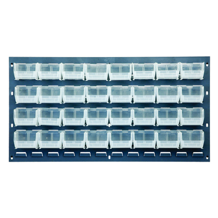 Quantum QLP-3619-210-32CL Louvered Panel Wall Mounted 36"L X 6"D X 19"H is a meticulously engineered storage solution designed to enhance organizational efficiency across various industrial sectors. This louvered panel is constructed from heavy-duty 16-gauge cold rolled steel, providing robust durability and a lasting service life. The panel features a gray enamel coated finish, offering resistance to wear and corrosion while maintaining an aesthetically pleasing appearance. Measuring 36 inches in length, 6 inches in depth, and 19 inches in height, the Quantum QLP-3619-210-32CL provides ample space for storage solutions. Included with this panel are 32 QUS210 clear bins, which offer excellent visibility and accessibility, ensuring stored items are easy to identify and retrieve. These clear bins contribute to an organized workspace, making it an ideal asset for settings such as manufacturing facilities, warehouses, and workshops. While the mounting hardware is not included, the design of this panel ensures easy installation, optimizing space utilization by keeping storage off the floor and within reach. The Quantum QLP-3619-210-32CL is a versatile and efficient choice for industries seeking to streamline operations through improved storage and organization.