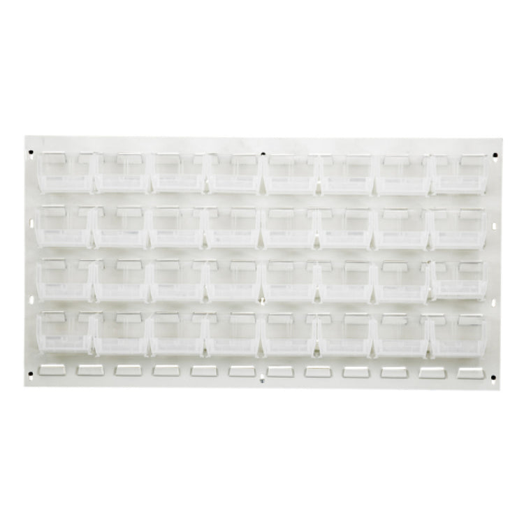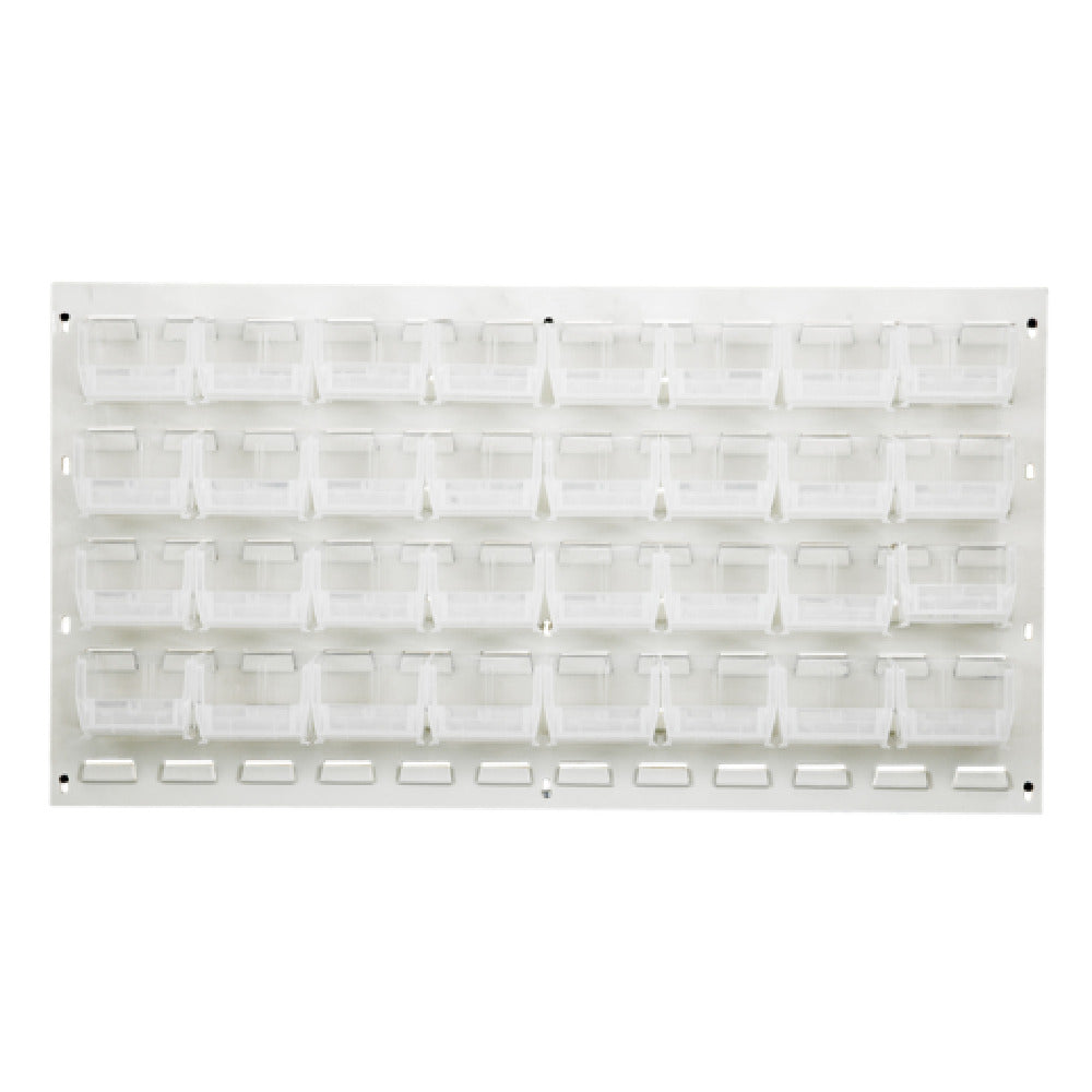 The Quantum QLP-3619HC-210-32CL Louvered Panel Wall Mounted 36"L X 6"D X 19"H is a versatile storage solution that combines practicality with durability, making it suitable for various industrial and commercial settings. This louvered panel is crafted from heavy-duty 16-gauge cold rolled steel, ensuring a robust structure capable of withstanding rigorous use. The panel is finished with an oyster white enamel coating, enhancing its resistance to wear and corrosion while providing a sleek aesthetic. Measuring 36 inches in length, 6 inches in depth, and 19 inches in height, this wall-mounted unit optimizes space utilization, making it ideal for environments where efficient organization is paramount. The inclusion of 32 QUS210 clear bins offers ample storage capacity while allowing for easy visibility and access to stored items, which is essential for quick inventory assessments and retrievals. Although mounting hardware is not included, the straightforward design facilitates seamless installation. This product is particularly valuable for industries such as manufacturing, automotive, and warehousing, where organized storage of small parts and components is crucial. The Quantum QLP-3619HC-210-32CL Louvered Panel stands out as a practical and durable solution for enhancing operational efficiency through effective space management.
