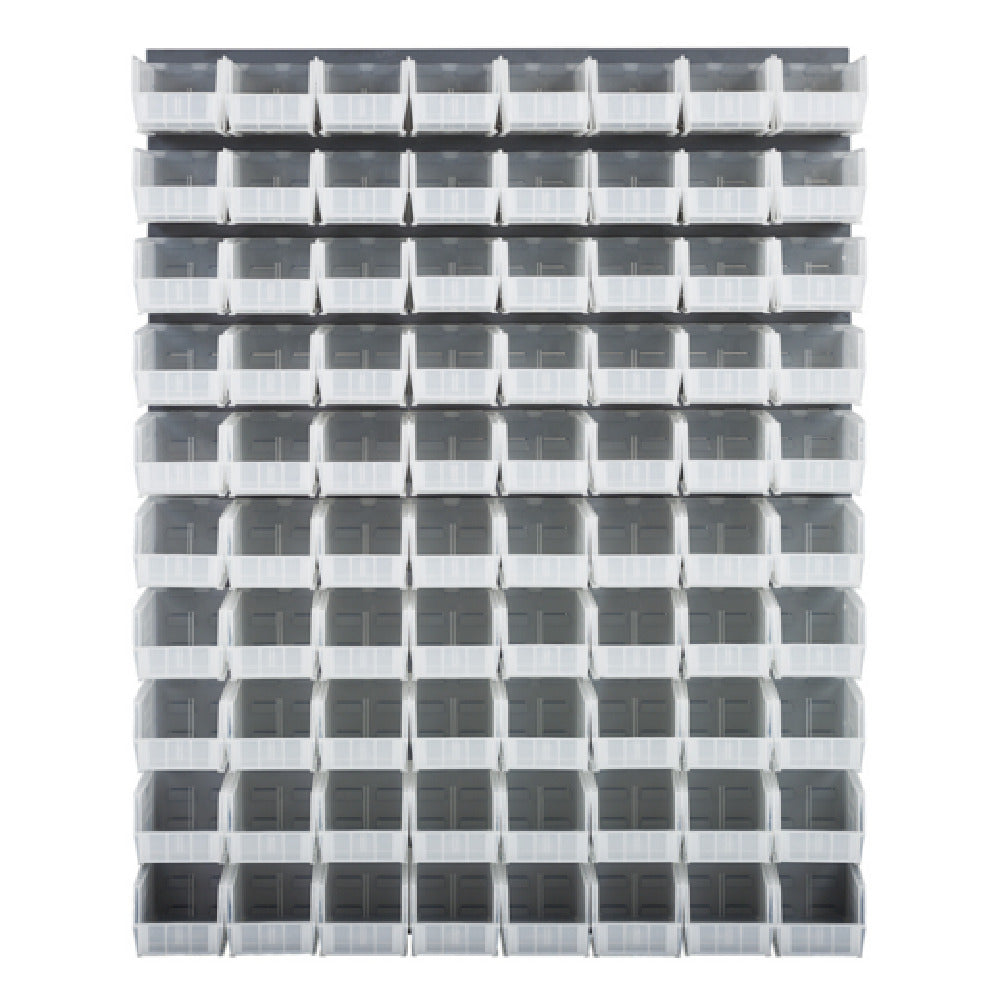 The Quantum QLP-4861-230-80CL Louvered Panel Wall Mounted 48"L X 11"D X 61"H is a precision-engineered storage solution, expertly designed to meet the diverse needs of various industries. This wall-mounted panel measures 48 inches in length, 11 inches in depth, and 61 inches in height, providing ample space for efficient organization and accessibility. Crafted from heavy-duty 16-gauge cold-rolled steel, it ensures unparalleled durability and longevity, making it a reliable choice for demanding environments. The gray enamel-coated finish not only adds a sleek aesthetic but also enhances resistance to wear and corrosion. Included with the panel are 80 clear QUS230 bins, which facilitate easy identification and retrieval of stored items, enhancing operational efficiency across different sectors, from manufacturing to retail. Please note, mounting hardware is not included, allowing you to customize the installation according to specific spatial requirements. The Quantum QLP-4861-230-80CL combines robust construction with practical design, making it an invaluable asset for optimizing storage and organization in professional settings.