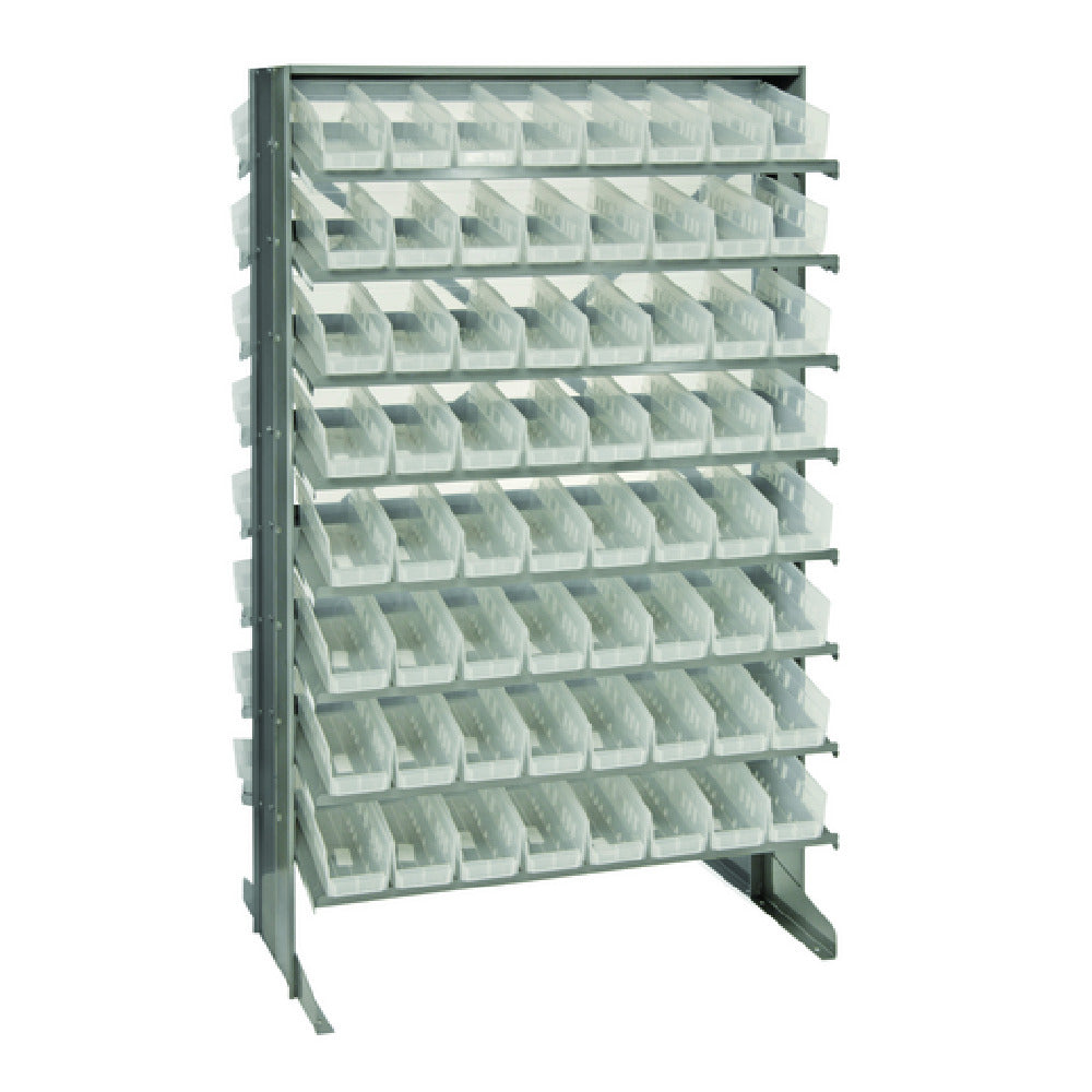 The Quantum QPRD-101CL Pick Rack Slopped Double-sided is a meticulously engineered storage solution designed to optimize organization and accessibility in various industrial settings. Measuring 24 inches in length, 36 inches in width, and standing 60 inches tall, this robust rack boasts an impressive 800-pound capacity, making it suitable for handling substantial loads efficiently. Its double-sided slopped design enhances accessibility, ensuring ease of picking from both sides, which is particularly advantageous in high-traffic environments such as warehouses and workshops. The rack features a comprehensive configuration with 16 shelves, offering ample space for diverse storage needs. Included with the rack are 128 QSB101 clear bins, providing transparent visibility for easy inventory management and swift retrieval of stored items. This innovative storage system is a valuable asset for businesses seeking to streamline their operations by maximizing space utilization and enhancing productivity. Its thoughtful design caters to various sectors, including manufacturing, distribution, and retail, by facilitating organized storage and efficient workflow. The Quantum QPRD-101CL Pick Rack stands out as a practical choice for enterprises aiming to improve their storage solutions with a focus on durability, capacity, and strategic design.