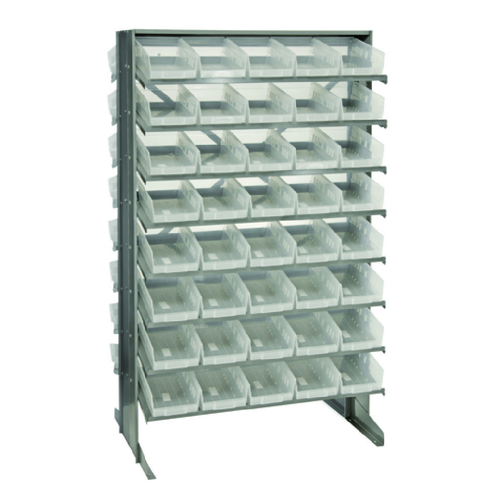 The Quantum QPRD-102CL Pick Rack Slopped Double-sided is a versatile storage solution designed to meet a wide range of industrial needs. Its dimensions, measuring 24"L x 36"W x 60"H, provide ample capacity while maintaining a compact footprint, making it suitable for various workspaces. This rack features a robust weight capacity of 800 lbs., ensuring it can support substantial loads without compromising stability or safety. The double-sided configuration, equipped with 16 shelves, maximizes storage efficiency and accessibility, allowing users to organize and retrieve items with ease. Included with the rack are 80 QSB102 clear bins, which facilitate easy identification and management of stored items. The slopped design enhances functionality by providing a user-friendly angle for accessing contents. Ideal for warehouses, manufacturing facilities, and retail environments, the Quantum QPRD-102CL offers a unique value proposition by combining significant storage capacity with flexibility and organization. Its durable construction and thoughtful design make it a reliable asset for businesses seeking to optimize their storage systems.
