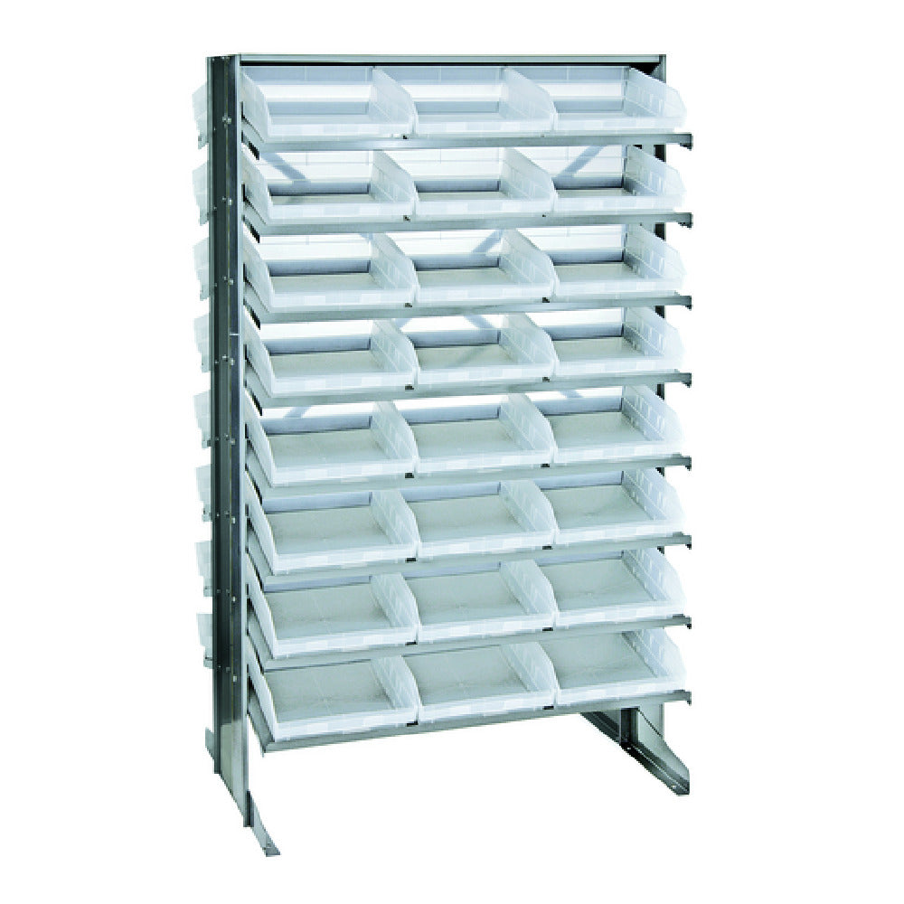 The Quantum QPRD-109CL Pick Rack Slopped Double-sided is a multifaceted storage solution designed to enhance organizational efficiency in various professional environments. Measuring 24 inches in length, 36 inches in width, and 60 inches in height, this robust unit supports a weight capacity of up to 800 lbs, making it suitable for handling substantial inventory loads. The rack's double-sided configuration, featuring 16 shelves, maximizes accessibility and storage potential. Included with the rack are 48 QSB109 clear bins, which provide a transparent view of contents, facilitating quick identification and retrieval of stored items. The slopped design of the rack not only aids in space optimization but also ensures easy access and ergonomic interaction, making it a preferred choice for warehouses, workshops, and retail environments. This pick rack's durable construction and thoughtful design cater to the needs of industries requiring high-volume storage and efficient item management, offering a practical solution to streamline operations and promote productivity. The Quantum QPRD-109CL stands out for its capacity to deliver organized, easily accessible storage within a compact footprint, appealing to a broad spectrum of market segments seeking reliable storage systems.