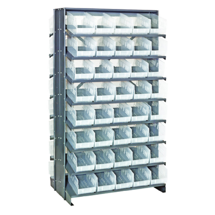 The Quantum QPRD-202CL Pick Rack Sloped Double-sided is engineered for efficiency and versatility in organizing and retrieving items across various industry segments, including warehousing, retail, and manufacturing. This robust unit measures 24 inches in length, 36 inches in width, and stands at 63-1/2 inches in height, accommodating a substantial weight capacity of up to 800 pounds. Featuring a sloped, double-sided design, it ensures easy access and visibility from both sides, enhancing workflow efficiency and minimizing retrieval time. The rack's configuration includes 16 shelves, offering ample space for a wide array of storage needs. Complementing its structural functionality, the rack comes equipped with 80 QSB202 clear bins, enabling organized storage and quick identification of contents. These features make the Quantum QPRD-202CL an indispensable tool for optimizing operational processes, ensuring that various segments such as logistics centers, retail backrooms, and production environments can benefit from its strategic design and capacity to handle diverse inventory management tasks.