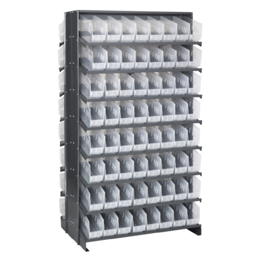 The Quantum QPRD-203CL Pick Rack Sloped Double-sided is a versatile storage solution engineered to enhance organizational efficiency across various industry sectors. This double-sided rack measures 36"L x 36"W x 63-1/2"H, providing ample storage with its robust 800 lbs. capacity. Designed with a practical slope, it facilitates easy access and retrieval of stored items, streamlining workflow processes. The rack features a 16-shelf configuration, optimizing space management and accommodating a wide range of inventory sizes. A key highlight includes the integration of 128 QSB203 clear bins, which offer transparency for quick visual identification and inventory checks. This makes the Quantum QPRD-203CL Pick Rack particularly valuable for industries such as warehousing, retail, and manufacturing, where efficient stock management is crucial. Its design emphasizes durability and adaptability, making it suitable for both small-scale operations and larger enterprises needing reliable, high-capacity storage solutions. Whether used in a fast-paced retail environment or an organized warehouse, the Quantum QPRD-203CL combines functionality with robust construction, serving as an essential component in optimizing space and improving inventory handling.