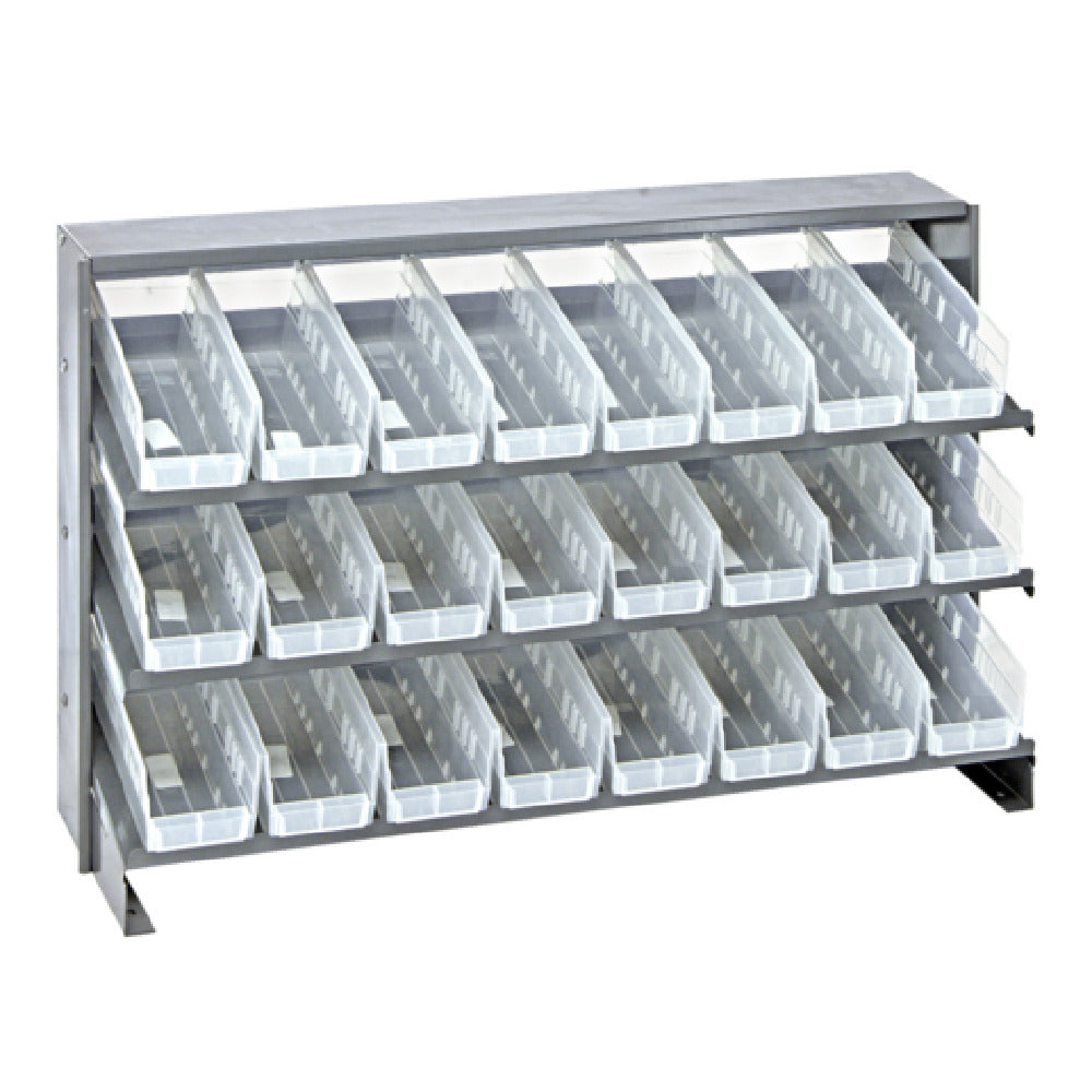 The Quantum QPRHA-101CL Pick Rack Slopped Bench Style is a versatile storage solution that caters to a variety of industrial and commercial environments. This robust rack features dimensions of 12-1/2"L x 36"W x 23"H and is engineered to support a substantial weight capacity of 250 lbs. Its innovative slopped bench design facilitates easy access and efficient organization, making it particularly advantageous for spaces that require quick retrieval of stored items. This model is configured with three shelves, providing ample storage flexibility. Additionally, it includes 24 QSB101 clear bins, allowing for a clear view of contents for rapid inventory assessment and selection. The integration of clear bins enhances the system's utility by streamlining the sorting and retrieval processes, which is essential for industries such as manufacturing, warehousing, and retail that demand high efficiency and organization. The Quantum QPRHA-101CL Pick Rack is engineered to optimize space while maintaining a durable and reliable structure, making it an invaluable component in any fast-paced operational environment where organization and accessibility are paramount.