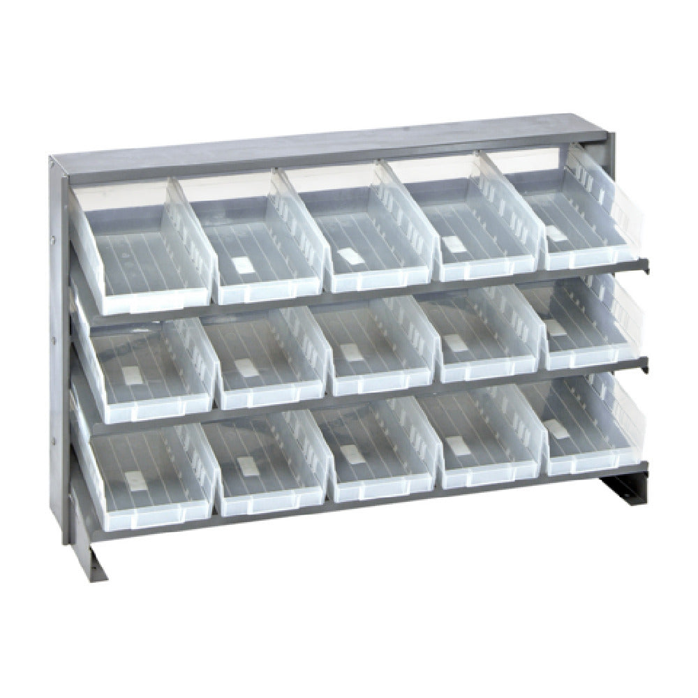 The Quantum QPRHA-102CL Pick Rack Slopped Bench Style is a meticulously designed storage solution tailored for diverse industrial and commercial applications. With dimensions of 12-1/2"L x 36"W x 23"H, this bench-style rack is engineered to fit compact spaces while offering substantial storage capacity. Its three-shelf configuration is capable of supporting up to 250 lbs, making it a robust choice for handling substantial weight. The sloped design enhances accessibility, ensuring that stored items are within easy reach, thereby improving efficiency in fast-paced environments. This model includes fifteen QSB102 clear bins, providing ample storage solutions with visibility, allowing for quick identification and retrieval of items. Particularly beneficial for inventory management in warehouses or retail settings, the clear bins facilitate streamlined organization and accessibility. The Quantum QPRHA-102CL Pick Rack is not only a functional storage system but also a durable one, constructed to withstand the rigors of daily use in demanding environments. Its thoughtful design and practical features make it an ideal choice for businesses seeking a balance of utility and durability in their storage infrastructure.