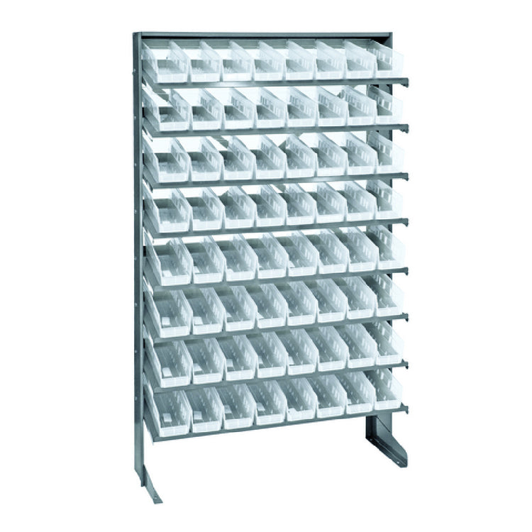 The Quantum QPRS-101CL Pick Rack Slopped Single-sided stands as a testament to efficient space utilization and organized storage solutions for various industry segments. This steel-constructed unit measures 12 inches in depth, 36 inches in width, and 60 inches in height, providing a well-balanced structure suitable for diverse settings. With a substantial weight capacity of 400 lbs, it accommodates heavy-duty storage needs effortlessly. The innovative design includes eight shelves that optimize vertical space, making it an ideal choice for sectors requiring systematic storage of components or products. Equally notable are the 64 QSB101 clear bins that come with the rack, offering transparent visibility and easy access to stored items, enhancing operational efficiency. The slopped, single-sided configuration further facilitates convenient retrieval and replenishment of contents, making it perfect for dynamic environments where quick access is essential. Such features collectively highlight the Quantum QPRS-101CL as a versatile storage solution, meeting the demands of industries ranging from manufacturing to warehousing and retail environments, where organizational precision and durability are paramount. This product exemplifies a blend of functional design and robust construction, catering to the nuanced storage needs of various professional domains.