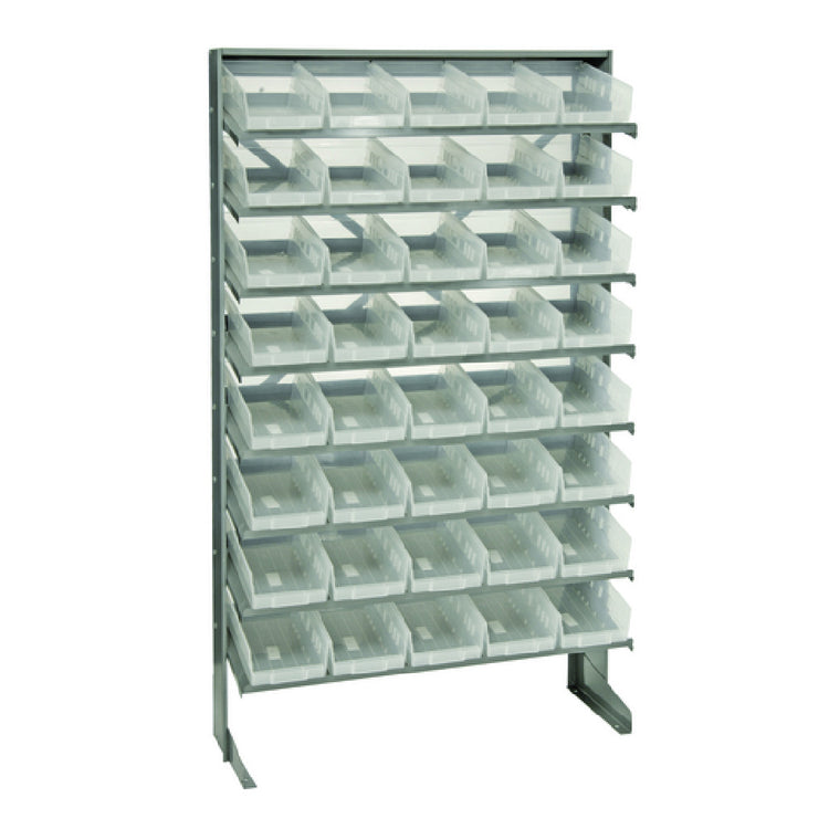 The Quantum QPRS-102CL Pick Rack Slopped Single-sided is a versatile storage solution designed to optimize space and efficiency in various industrial settings. This rack features a sloped, single-sided construction with dimensions of 12 inches in depth, 36 inches in width, and 60 inches in height, making it an ideal fit for a range of storage needs. With a robust capacity of 400 lbs, it is engineered to support substantial loads. The structure includes eight sturdy steel shelves, providing ample space for organization. Additionally, the rack comes equipped with 40 QSB102 clear bins, offering practical storage visibility and easy access to stored items. The clear bins enhance the rack's functionality by allowing users to quickly locate and retrieve materials, thus improving overall workflow efficiency. This pick rack is especially beneficial for warehouses, retail environments, and other spaces that require systematic storage solutions. Its durable steel construction ensures long-lasting performance, even in demanding conditions, making the Quantum QPRS-102CL Pick Rack a reliable choice for businesses looking to streamline their operations through well-organized storage systems.