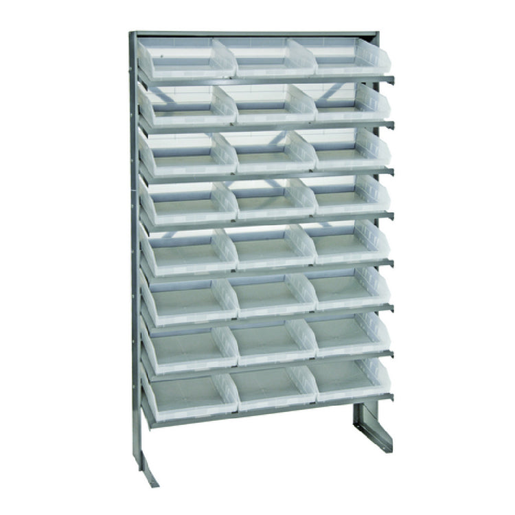 The Quantum QPRS-109CL Pick Rack Slopped Single-sided is a versatile and efficient storage solution designed for a variety of industrial applications. With dimensions of 12"D x 36"W x 60"H, this unit is constructed from durable steel, ensuring stability and longevity across numerous environments. It has a substantial load capacity of 400 lbs, making it suitable for storing a wide range of items. The pick rack includes eight adjustable shelves, allowing for customizable organization to meet specific storage needs. Additionally, the unit comes equipped with 24 QSB109 clear bins, providing ample space for categorizing and accessing stored components with ease. The single-sided sloped design facilitates ergonomic access, making it an ideal choice for enhancing productivity and efficiency in warehouses, workshops, and retail settings. Whether used in manufacturing, distribution, or retail, the Quantum QPRS-109CL Pick Rack offers a reliable and practical solution for streamlined item retrieval and storage management.
