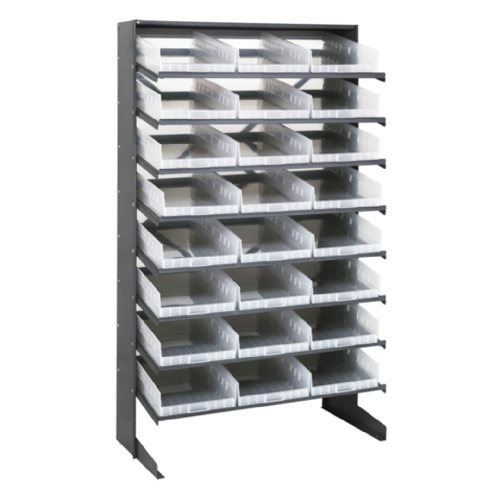 The Quantum QPRS-110CL Pick Rack Slopped Single-sided is a robust and versatile storage solution designed for efficiency and organization in various industry segments. Measuring 18"D x 36"W x 60"H, this pick rack is engineered from durable steel, offering a substantial capacity of up to 400 lbs. It features a smart sloped design, which enhances accessibility and ease of use, particularly in fast-paced environments where quick retrieval is essential. The unit comes equipped with eight sturdy shelves, providing ample space for systematic storage. Additionally, the inclusion of 24 clear QSB110 bins ensures that contents are visible and easily identifiable, facilitating streamlined operations. This pick rack is particularly suited for warehouses, workshops, and retail settings, where maximizing space while maintaining order is crucial. The single-sided configuration allows for placement against walls, optimizing floor space while providing convenient access to stored items. The Quantum QPRS-110CL Pick Rack's thoughtful design and robust construction make it a reliable asset for businesses seeking to enhance their storage capabilities with a focus on efficiency and durability.
