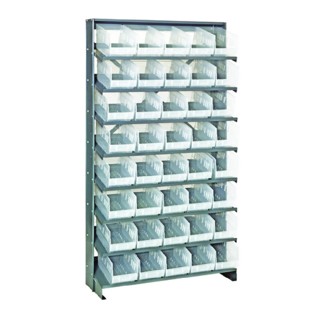 The Quantum QPRS-202CL Pick Rack Slopped Single-sided is a meticulously designed storage solution, featuring a comprehensive capacity of 400 lbs. This steel pick rack is tailored to meet diverse organizational needs in industrial settings, facilitating efficient storage and retrieval operations. Its dimensions - 12" depth, 36" width, and 63-1/2" height - enable it to fit seamlessly into various workspace configurations. The innovative slopped design enhances visibility and access to stored items, making it a practical choice for environments requiring quick and frequent material handling. Equipped with eight sturdy shelves, it provides ample storage space, while the inclusion of 40 clear QSB202 bins ensures optimal organization and easy identification of contents. The single-sided configuration is specifically crafted to optimize space utilization, catering to industries where floor space is at a premium. Its durable steel construction guarantees longevity and resilience, accommodating heavy-duty applications. This product's clear bins not only contribute to a streamlined aesthetic but also facilitate inventory management by allowing instant visual checks. The Quantum QPRS-202CL Pick Rack is an ideal storage companion for industries ranging from manufacturing to warehousing, offering a reliable and efficient storage solution tailored to enhance productivity and organization.