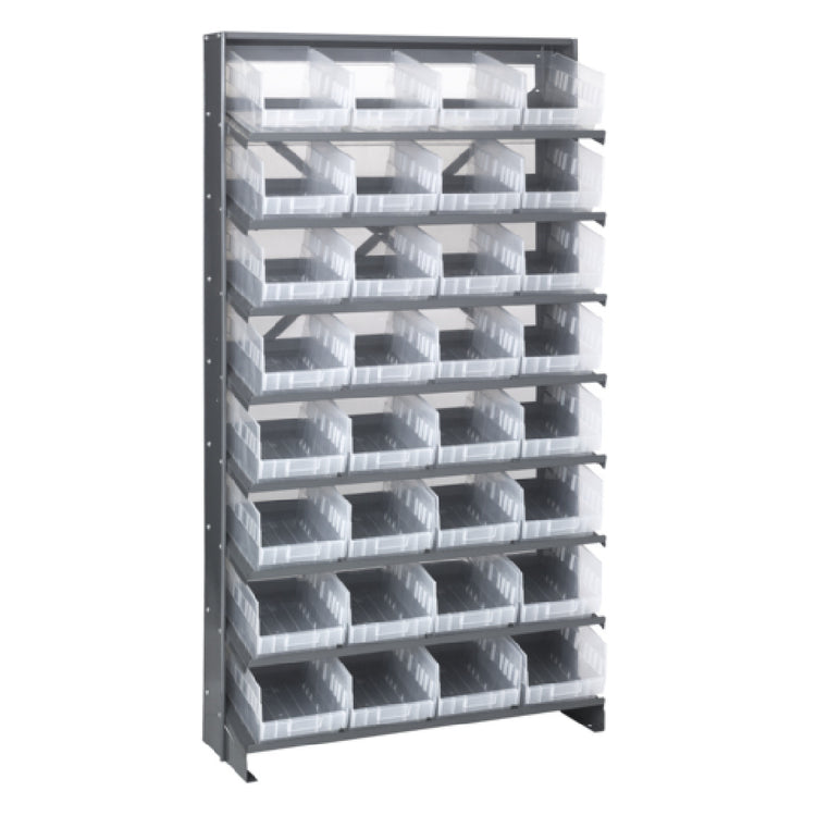 The Quantum QPRS-207CL Pick Rack Slopped Single-sided is a robust storage solution tailored for industries requiring organized and efficient inventory management. Measuring 12 inches in depth, 36 inches in width, and 63-1/2 inches in height, this single-sided rack is engineered for spaces where streamlined access and organization are priorities. It boasts a weight capacity of 400 pounds, accommodating substantial storage needs without compromising on stability. The rack features eight sturdy shelves, each complemented by 32 QSB207 clear bins, facilitating easy visibility and access to stored components. Crafted from durable steel, the Quantum QPRS-207CL ensures long-lasting performance, making it invaluable for warehouses, workshops, and retail environments where durability is key. Its slopped design enhances ergonomic access, reducing retrieval time and improving workflow efficiency. The use of clear bins further aids in quick identification of contents, optimizing inventory management. This rack is an ideal choice for operations seeking to enhance storage organization and efficiency with a reliable, high-capacity unit.