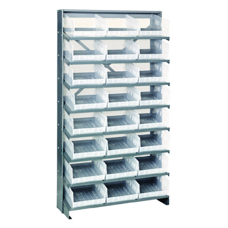 The Quantum QPRS-209CL Pick Rack Slopped Single-sided is a meticulously designed storage solution, featuring dimensions of 12"D x 36"W x 63-1/2"H and a robust weight capacity of 400 lbs. Constructed from durable steel, this single-sided pick rack is engineered for efficiency and practicality in various industry settings. It includes eight strategically positioned shelves, providing ample space for organized storage and easy accessibility. Accompanying the shelves are 24 QSB209 clear bins, which offer transparent visibility to quickly identify stored items without hassle. The slopped design enhances user convenience by facilitating an ergonomic reach to stored materials, making it particularly beneficial in environments such as warehouses, workshops, and retail storage areas where time efficiency and organization are crucial. The Quantum QPRS-209CL combines structural integrity with versatile storage options, catering to diverse operational needs while maintaining a compact footprint. Its clear bins and sturdy framework ensure both visual clarity and lasting durability, positioning this pick rack as an essential asset for businesses aiming to optimize their storage efficiency and streamline their material handling processes.