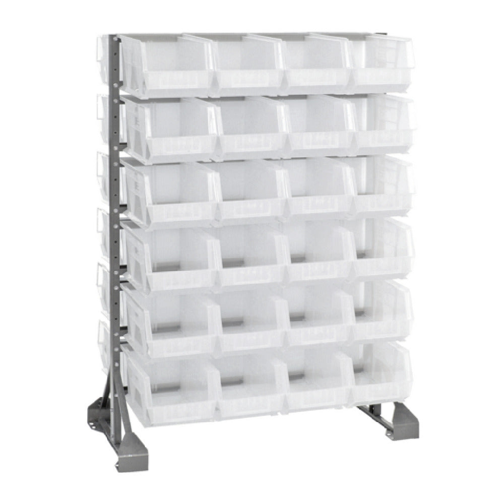 The Quantum QRU-12D-240-48CL Rail Rack is a versatile double-sided storage solution, measuring 36 inches in width, 20 inches in depth, and 53 inches in height. This robust unit boasts a load capacity of 1500 pounds, making it an ideal choice for various industrial and commercial environments where high-capacity storage is essential. It comes equipped with 12 rails, allowing for efficient organization and accessibility of stored items. Additionally, the rack includes 48 clear bins of the QUS240 model, enhancing visibility and inventory management for users. The combination of its spacious dimensions and significant load capacity underscores its suitability for industries such as manufacturing, warehousing, and retail, where maximizing storage efficiency is crucial. The clear bins not only facilitate quick identification of contents but also promote a streamlined workflow by minimizing retrieval time. This product's design caters to businesses seeking a reliable storage system that accommodates a substantial volume of materials while maintaining organization. Its construction ensures durability and reliability, essential for environments that demand consistent performance. The Quantum QRU-12D-240-48CL Rail Rack thereby stands as a specialized storage solution, tailored to meet the diverse needs of sectors that prioritize storage efficiency and organization in their operational processes.
