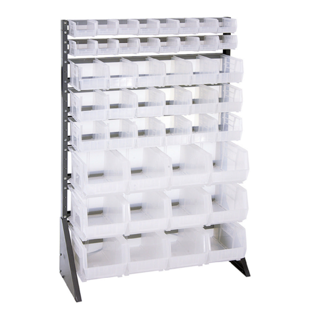 The Quantum QRU-16S-220230240CL Rail Rack, single-sided, stands as an essential storage solution in various industrial settings, distinguished by its impressive specifications and capacity. Measuring 36 inches in width, 15 inches in depth, and 53 inches in height, this rack unit is designed to accommodate a substantial load capacity of 600 pounds. This robust structure includes 16 durable rails, which support the storage of various bin sizes for diverse organizational needs. It comes equipped with 16 QUS220, 18 QUS230, and 12 QUS240 clear bins, providing significant storage flexibility and visibility of contents, crucial for quick identification and access. Tailored for environments that demand high efficiency and space optimization, such as warehouses, workshops, and manufacturing facilities, the Quantum QRU-16S-220230240CL Rail Rack offers a strategic advantage through its thoughtful design that maximizes vertical space utilization. Its clear bins enhance operational efficiency by reducing the time spent searching for items, thus streamlining workflows and supporting sustainable practices. This storage system is ideal for professionals seeking a reliable, sturdy, and adaptable storage solution that aligns with industry-specific organizational standards and demands.