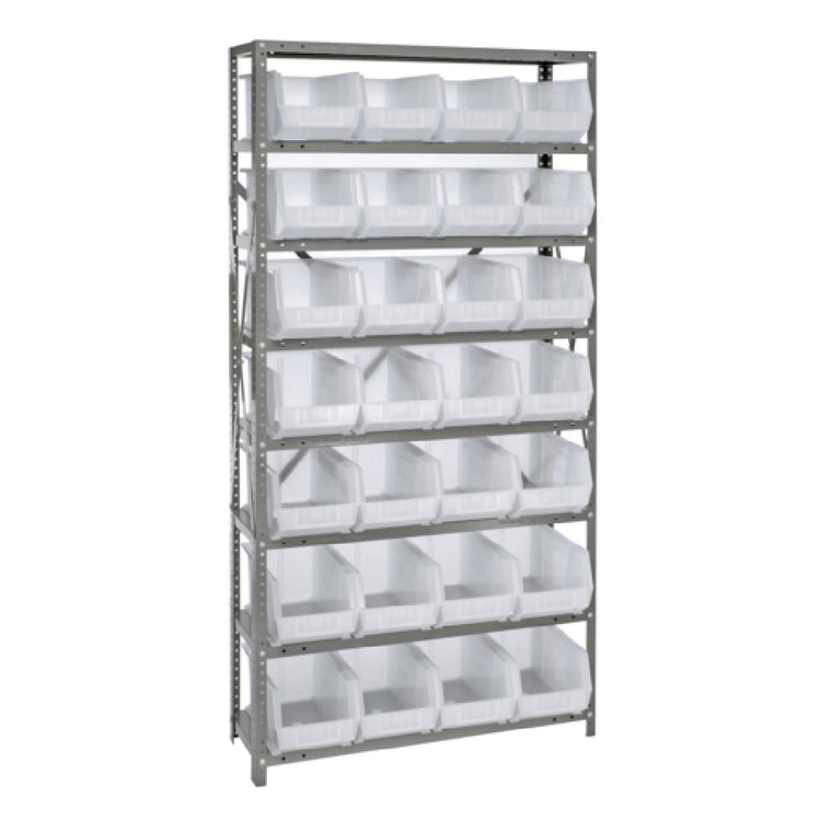 The Quantum QSBU-239CL Shelving Unit 12"D x 36"L x 75"H Heavy Duty is engineered to meet the demanding needs of various industrial sectors, providing a robust storage solution with a substantial 400 lb. load capacity per shelf. This shelving unit is outfitted with eight durable shelves, ensuring ample space for a wide array of storage requirements. The inclusion of 28 QUS239 clear bins enhances organizational efficiency, allowing users to easily categorize and access stored items. Constructed with uprights and cross bars, this unit is designed for stability and strength, making it ideal for environments where heavy-duty storage is essential. The smooth powder coat finish not only augments the unit's durability but also adds a refined aesthetic suitable for both industrial and commercial settings. The Quantum QSBU-239CL is an excellent choice for warehouses, workshops, and other high-demand settings, delivering unparalleled reliability with its high-capacity design and robust construction.