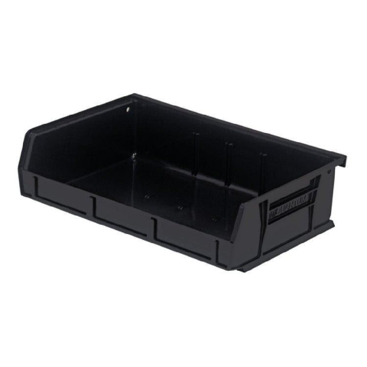 The Quantum QUS236BR Bin Stacking or Hanging unit, with dimensions of 11 inches in width, 7-3/8 inches in depth, and 3 inches in height, serves as a versatile storage solution for a range of industrial applications. Manufactured from recycled polypropylene and colored in black, this bin is both durable and environmentally conscious, proudly made in the USA. It features front, back, and side grips that enable easy handling and positioning, whether stacked or hung. The bin is equipped with an anti-slide lock, ensuring stability when multiple bins are stacked. Additionally, it provides three divider slots, offering customizable storage options to suit varying organizational needs. The rear hanger facilitates secure hanging, maximizing space utility. A molded-in label holder is included, allowing for easy identification and organization of contents. This bin is packaged individually but must be purchased in multiples of eight, catering to industrial buyers who require bulk storage solutions. The Quantum QUS236BR Bin is designed to enhance efficiency and orderliness within any workspace, making it an integral component for inventory management and operational logistics across various sectors.