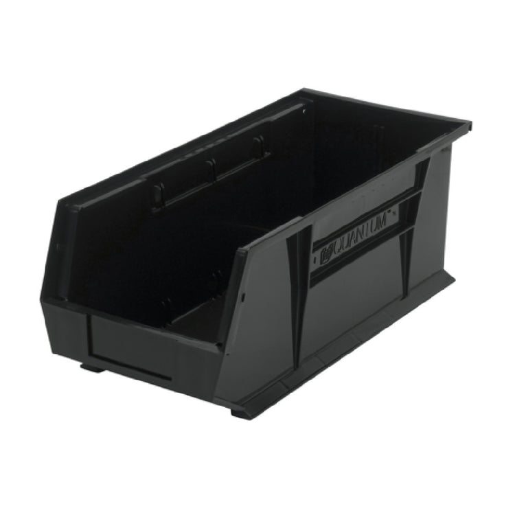 The Quantum QUS248BR Bin Stacking or Hanging is a versatile storage solution tailored for various industrial and organizational needs, measuring 8-1/4"W x 18"D x 7"H. Constructed from durable recycled polypropylene, this black bin exemplifies sustainability and resilience. It features front, back, and side grips to aid in easy handling, and its anti-slide lock securely keeps the bin in place when stacked. Additionally, the bin is designed with a single divider slot to accommodate customizable storage options. The rear hanger offers further versatility, enabling the bin to be used in both stacking and hanging configurations. A molded-in label holder ensures efficient organization and easy identification of contents, streamlining operations in busy environments. Proudly made in the USA, the Quantum QUS248BR Bin is required to be purchased in multiples of six, catering to bulk storage requirements. This bin is an excellent choice for warehouses, workshops, and organizational systems where efficiency and durability are paramount.