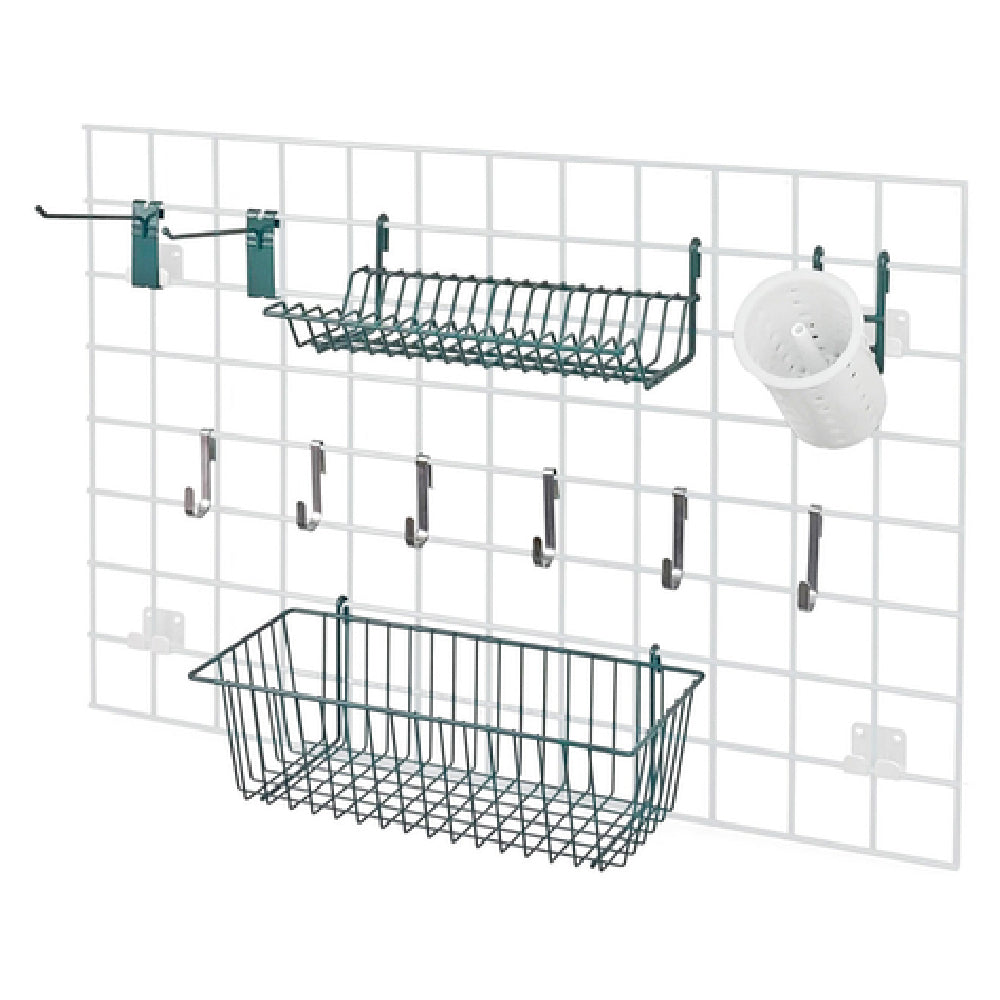 The Quantum SG-A1 Store Grid Accessory Pack is an essential collection designed to enhance organization and efficiency in retail or food service environments. Featuring a 17"W x 7"D x 5"H basket, this pack ensures ample storage space for various items, accommodating a range of needs. Complementing the basket, the pack includes a lid holder drying rack, providing a practical solution for drying or displaying lids. The cylinder holder and flatware cylinder are integral components, offering specialized storage for cylindrical and flatware items, thus optimizing space utilization. Equipped with (2) 6" hooks and (6) small hooks, this accessory pack allows for versatile hanging options, enhancing display flexibility and accessibility. The entire set is coated in a green epoxy antimicrobial finish, ensuring durability and resistance to microbial growth, making it suitable for environments that prioritize hygiene. Certified by the NSF, the Quantum SG-A1 Store Grid Accessory Pack meets high standards of public health and safety, reinforcing its reliability in professional settings. This comprehensive accessory pack is an invaluable asset for businesses seeking to streamline operations and maintain organized, hygienic spaces.