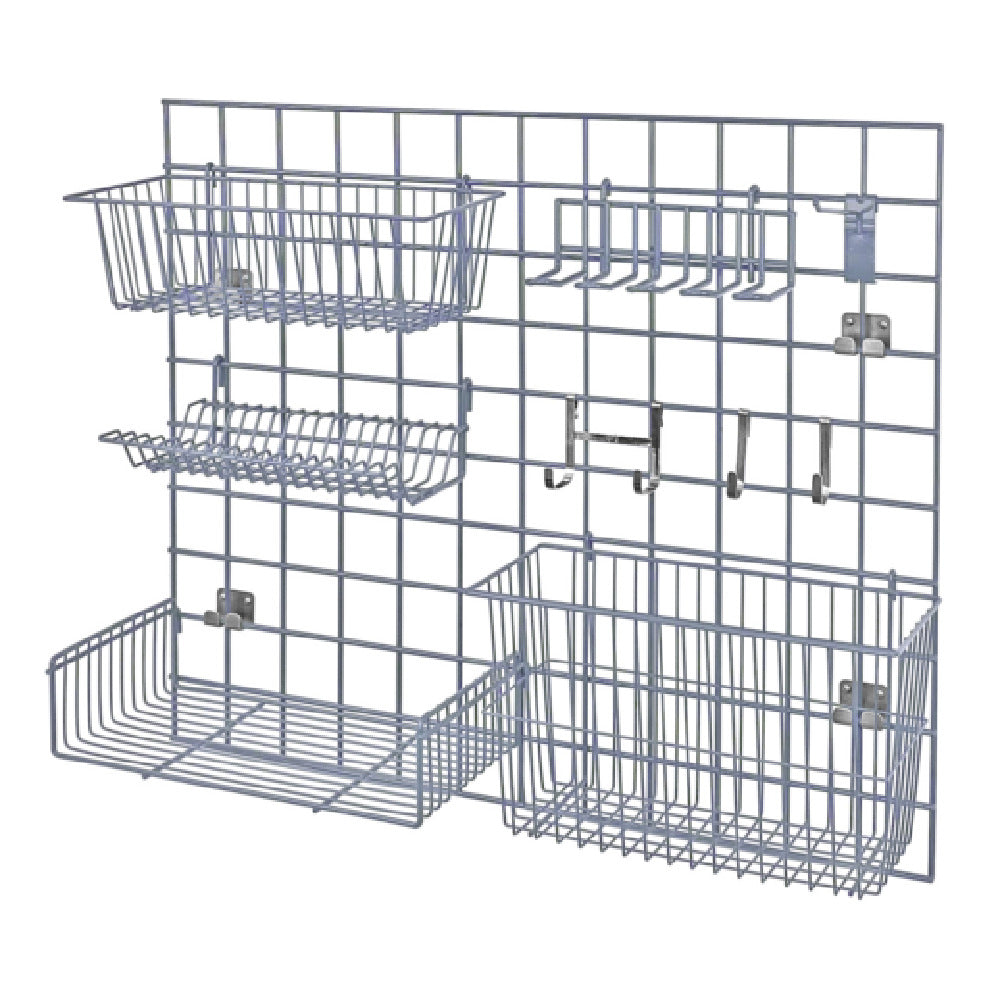 The Quantum SGK-3036-1GY Store Grid Light-Duty Kit is an adaptable and practical solution for a variety of storage needs, making it suitable for retail environments, workshops, or home organization. This kit includes a 36"W x 30"H grid panel, accompanied by a versatile range of storage components. It features a 17"W x 7"D x 5"H basket and a larger 17"W x 7"D x 10"H basket, catering to different storage requirements. Additionally, an 18"W x 9"D small shelf provides extra space for organizing smaller items. This kit also comes with a lid holder drying rack and a 4"W utensil holder, ensuring optimal organization and functionality. The range of hooks, including one 6" hook, two small hooks, and one double large hook, offer flexibility in hanging various items. For secure attachment, the kit includes a direct wall mounting bracket. The entire set boasts a durable gray epoxy antimicrobial finish, promoting hygiene and longevity. NSF certification further attests to its quality and compliance with safety standards. Designed for light-duty use, the Quantum SGK-3036-1GY brings a comprehensive, reliable, and efficient storage solution to diverse market segments seeking structured organization.