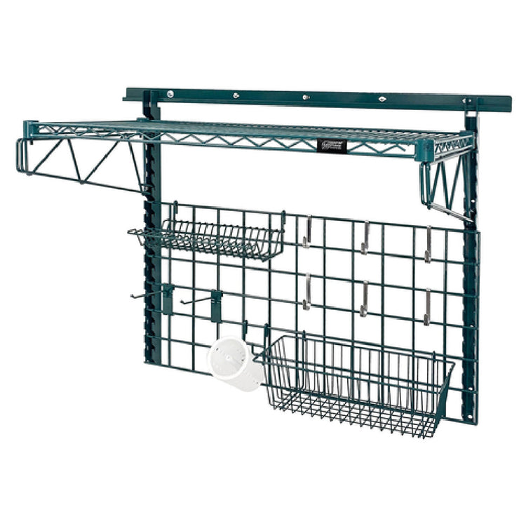 The Quantum SGK-401836-2P Store Grid Medium-Duty Kit is a comprehensive storage solution designed for versatile applications across various industries. This kit includes a 40" wall track, complemented by two 31" uprights for enhanced stability. It features two 18" single cantilever arms, providing robust support for storage needs. The package is completed with a 36"W x 18"D shelf (1836P), ideal for organizing items efficiently. Additionally, a 36"W x 18"H grid panel offers a structured framework for various attachments. The kit includes a 17"W x 7"D x 5"H basket, perfect for storing smaller items. A lid holder drying rack and a cylinder holder are incorporated for added utility, alongside a flatware cylinder for utensil organization. The inclusion of two 6" hooks and six small hooks facilitates versatile hanging options, enhancing the kit’s adaptability. Finished with a green epoxy antimicrobial coating, this product ensures durability and hygiene, meeting NSF standards for safety and quality. The Quantum SGK-401836-2P kit is engineered to provide a reliable and adaptable storage solution, making it a valuable asset for environments requiring efficient organization and space utilization.