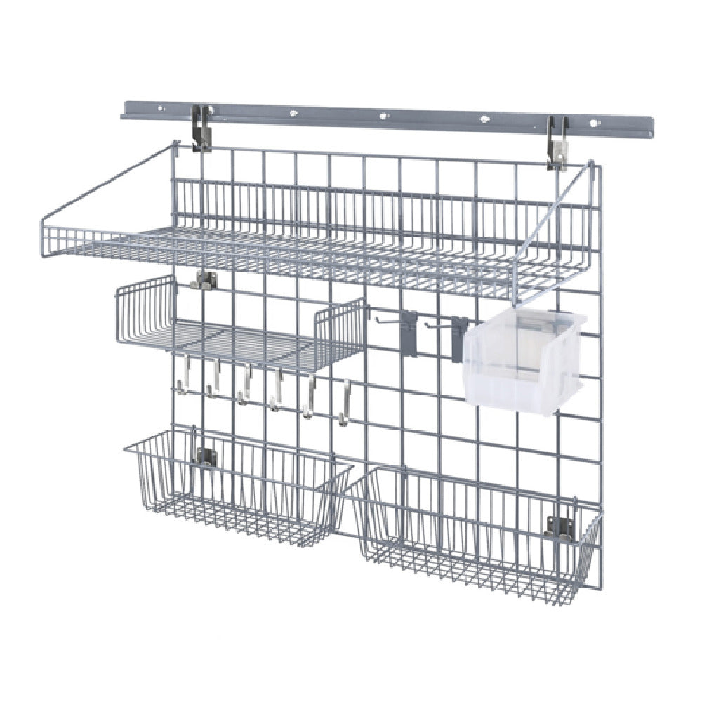 The Quantum SGK-401836-4GYCL Store Grid Medium-Duty Kit is an innovative storage solution designed to meet the needs of various industrial segments. This comprehensive kit includes a 40-inch wall track, providing a sturdy foundation for the storage system. Complementing the wall track are two 31-inch uprights and two 18-inch single cantilever arms, which together form a versatile framework for organizing space efficiently. The kit features a 36-inch by 18-inch shelf (1836P), perfect for supporting a variety of items with ease. Additionally, a 36-inch wide by 18-inch high grid panel further enhances storage capabilities, allowing for customized configurations. The package also includes a 17-inch wide by 7-inch deep by 5-inch high basket, ideal for smaller items, and an 18-inch wide by 9-inch deep small shelf for additional organization options. For versatile utility, the kit provides two 6-inch hooks and six small hooks, catering to various hanging requirements. A single bin holder and a QUS230 clear bin offer convenient storage for loose items. Finished with a gray epoxy antimicrobial coating, the kit ensures durability and hygiene, adhering to NSF standards. This product is tailored for industries demanding reliable and adaptable storage solutions.