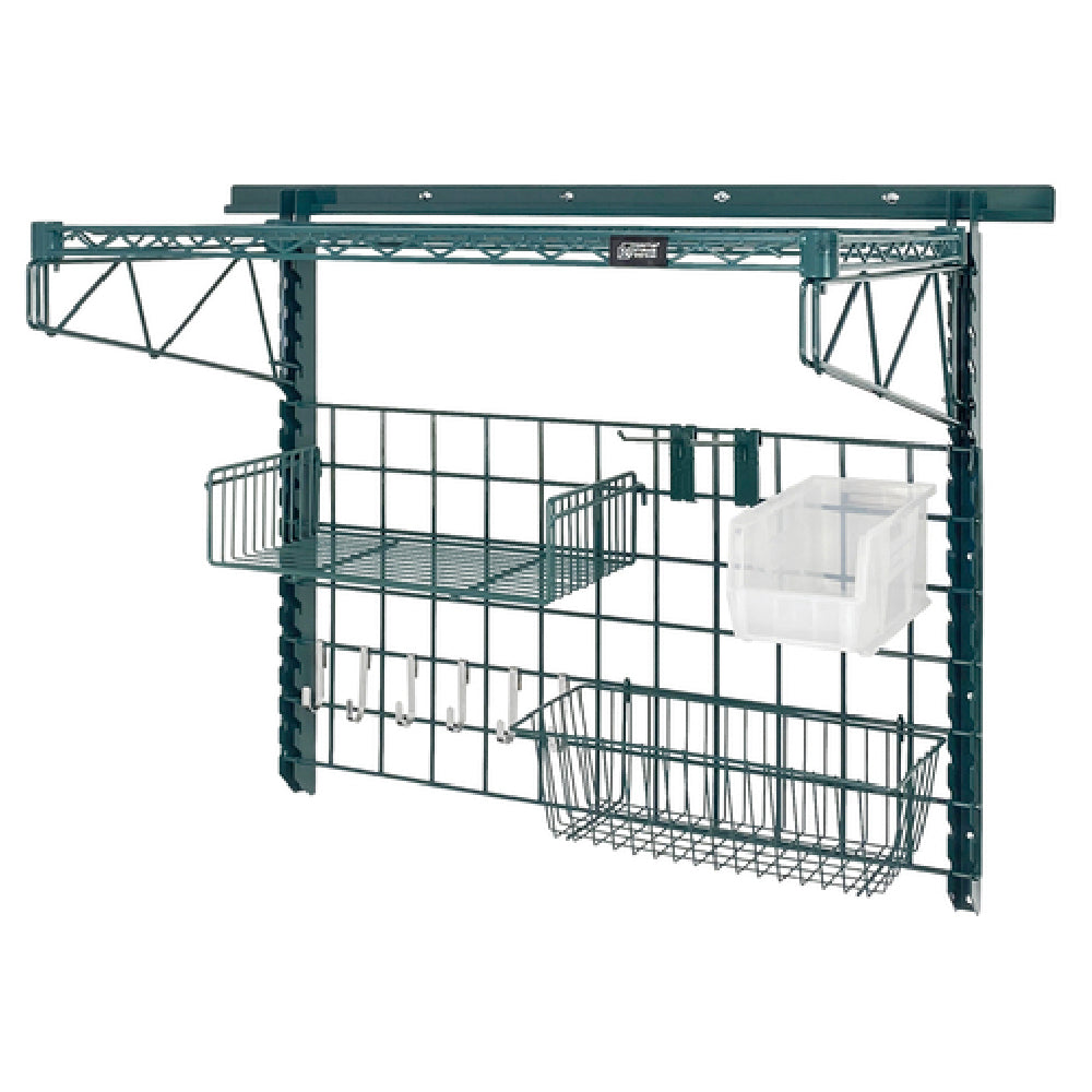The Quantum SGK-401836-4PCL Store Grid Medium-Duty Kit is a versatile storage solution featuring a comprehensive selection of components designed for medium-duty organizational needs. Central to this kit is a 40-inch wall track that provides sturdy support for various storage configurations. It includes two 31-inch uprights and a pair of 18-inch single cantilever arms, allowing for customizable adjustment and arrangement of storage elements. The kit is equipped with a 36-inch wide by 18-inch deep shelf (1836P), offering ample space for storing a range of items. Additionally, it includes a 36-inch wide by 18-inch high grid panel that enhances the structural integrity and versatility of the storage system. For smaller storage requirements, the kit provides a 17-inch wide by 7-inch deep by 5-inch high basket and an 18-inch wide by 9-inch deep small shelf. It also includes two 6-inch hooks and six small hooks for hanging items, a single bin holder, and one QUS230 clear bin, all coated with a green epoxy antimicrobial finish for enhanced hygiene. Certified by NSF, this kit is suitable for various industrial and commercial applications, offering a reliable and organized storage solution.
