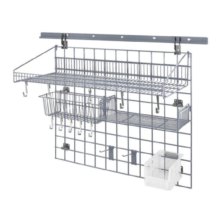 The Quantum SGK-403036-2GYCL Store Grid Standard-Duty Kit is a versatile storage solution tailored for dynamic organizational needs. It includes a 40-inch wall track, providing a sturdy foundation for mounting and maximizing vertical space. The kit comes with a 36-inch wide by 30-inch high grid panel, designed to accommodate various storage configurations. A large shelf measuring 36 inches in width and 18 inches in depth offers ample space for bulkier items, while the 17-inch wide by 7-inch deep by 5-inch high basket provides a convenient spot for smaller items. Additionally, the kit features a single bin holder and a QUS230 clear bin, ideal for sorting and storing smaller components or tools. The wall track mounting bracket ensures secure installation, enhancing the kit's stability and durability. Finished in a gray epoxy antimicrobial coating, this kit not only resists corrosion but also meets NSF standards for hygiene, making it suitable for environments where cleanliness is paramount. This adaptability makes the Quantum Store Grid a valuable asset across various industries, from retail to workshops, where organized and efficient storage is essential.