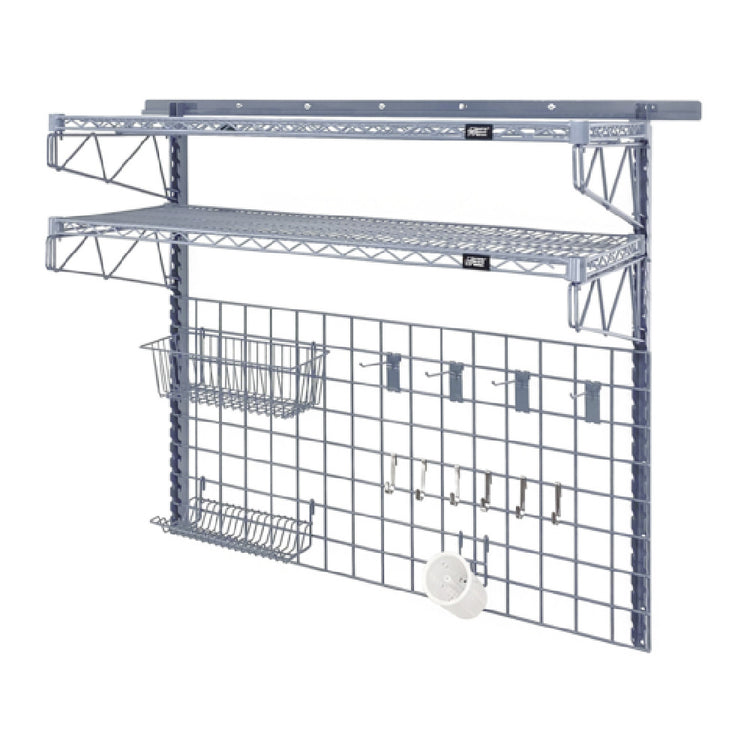 The Quantum SGK-562448-1GY Store Grid Medium-Duty Kit is a comprehensive storage solution tailored for various industry needs, featuring a 56-inch wall track for versatile installation. This medium-duty kit includes two 44-inch uprights and four 18-inch single cantilever arms, providing a robust framework for organizing tools, equipment, or inventory. The kit also comes with two shelves measuring 36 inches in width and 18 inches in depth (1836P), ensuring ample storage space. A 48-inch by 24-inch grid panel complements the structural components, allowing for customized arrangement of items. A 17-inch by 7-inch by 5-inch basket offers additional storage for smaller items, while a lid holder drying rack ensures organized maintenance of lids and covers. The kit includes four 6-inch hooks and six small hooks for hanging tools or accessories, enhancing accessibility and organization. A cylinder holder and a flatware cylinder round out the package, providing specialized storage for cylindrical items and flatware. Finished in a gray epoxy antimicrobial coating, this kit is NSF certified, emphasizing its suitability for environments requiring stringent hygiene standards. The Quantum SGK-562448-1GY Store Grid Medium-Duty Kit is engineered for efficiency and adaptability, making it a valuable asset across various professional settings.