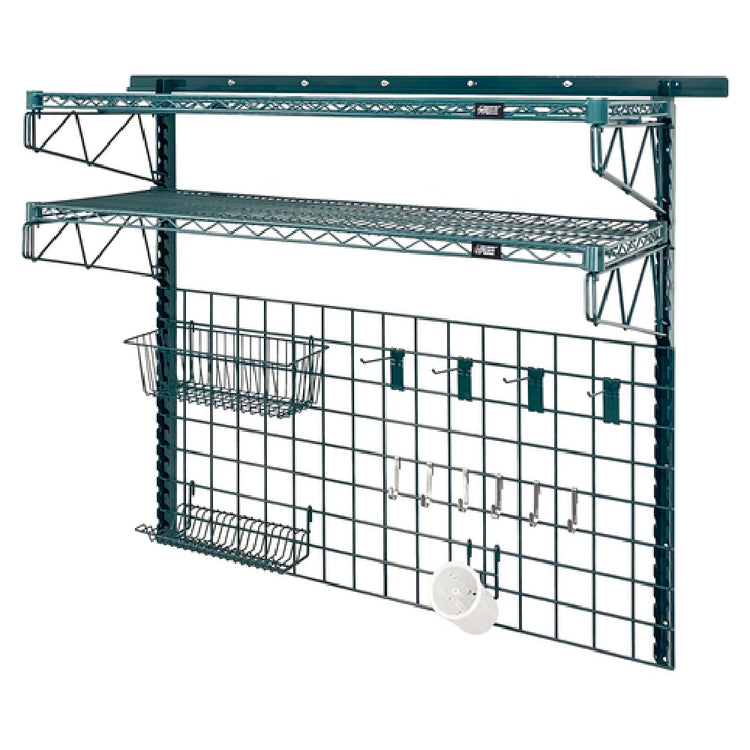 The Quantum SGK-562448-1P Store Grid Medium-Duty Kit is a comprehensive storage solution designed to enhance organizational efficiency in various settings. This kit includes a 56-inch wall track, providing a sturdy foundation for the components that follow. It features two 44-inch uprights, offering robust support for diverse storage configurations. The kit is further equipped with four 18-inch single cantilever arms, facilitating versatile shelving arrangements. Additionally, it includes two shelves measuring 36 inches in width by 18 inches in depth (1836P), allowing for ample storage space. A 48-inch wide by 24-inch high grid panel is also included, enhancing the versatility of the storage system. For smaller items, the kit includes a 17-inch wide by 7-inch deep by 5-inch high basket, along with a lid holder drying rack for convenient drying solutions. The inclusion of four 6-inch hooks and six small hooks provides additional storage options for hanging items. A cylinder holder and a flatware cylinder complete the kit, ensuring comprehensive storage capabilities. The green epoxy antimicrobial finish not only adds durability but also promotes hygiene, aligning with NSF standards. This kit is ideal for industries requiring adaptable, organized, and hygienic storage solutions.